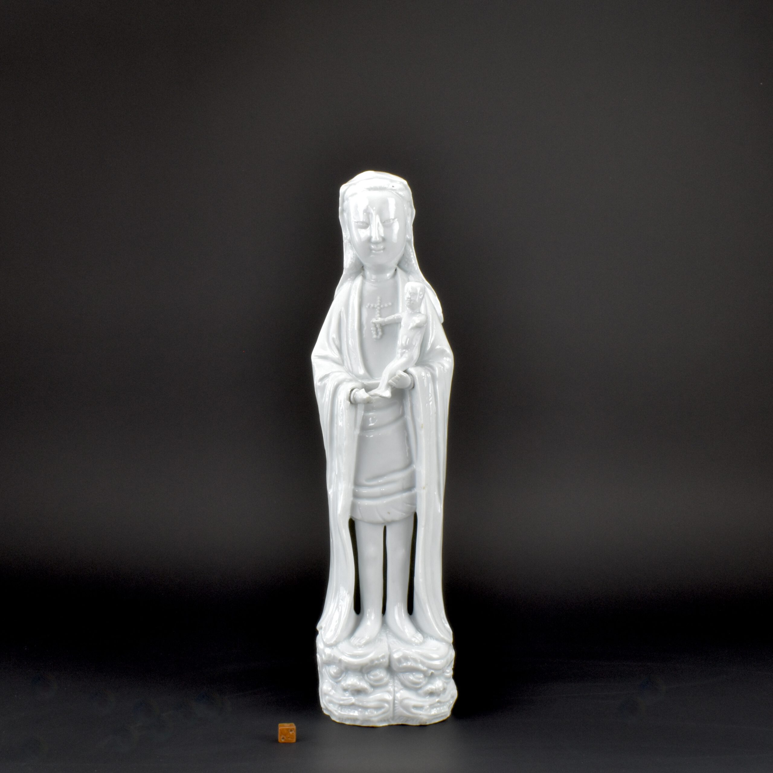 - Description : 'Dehua' figure of the Madonna and Child. The female figure is standing on the head of an animal or monster and is holding a small boy in her arms. One finger is highlighted with gold. She is modelled after figures of the Chinese Goddess of Mercy, 'Guanyin', who is typically depicted on a tiger holding a child. Both mother and child, however, have European features and curly hair, the woman also wears a non-Chinese headdress and the child holds a rosary, so that this sculpture is identified as the Christian Holy Mother, the Virgin Mary carrying the infant Christ, rather than a Buddhist mother goddess.
