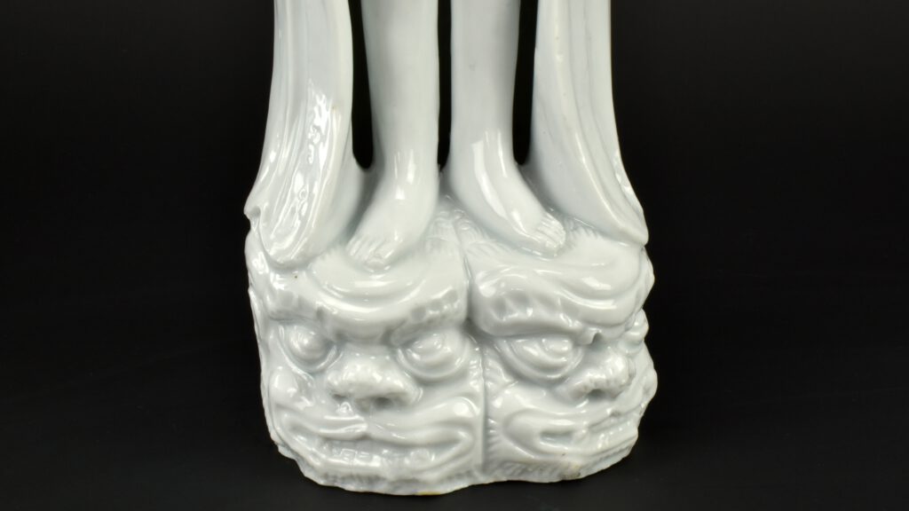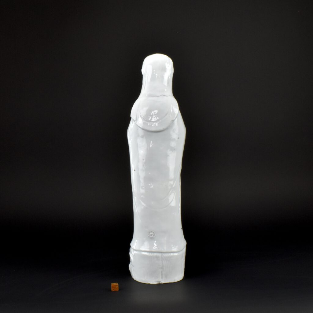 A Very Rare and Unusually Large Kangxi Blanc de Chine Porcelain Model of The Virgin Mary Carrying the Infant Christ. Dehua Kilns, Fujian Province, Kangxi Period c.1670-1720. From the collection of The painter Clemens Merkelbach van Enkhuizen (1937-2023). A similar Blanc de Chine model from the collection of J.P. Donnelly is now in the British Museum, see ‘Information’ below the Photograph Gallery. A example that matches the present figure, also from the collection of J.P. Donnelly now in the British Museum, see ‘References’. Figures called Sancta Marias‘ (blessed Marys) are recorded, for example, in the sale list for the cargo of the Nassau, an English ship which returned to England from Amoy (Xiamen) in 1699 (Oriental Export Market Porcelain by Geoffrey Godden, Harper Collins Publishers Ltd, pp. 259-60). Christian Blanc de Chine figures are very rare, many like the present example, seem to merge the Christian image of Mary and Child with hints of the Chinese deity Guanyin holding a child. After all, both were a representation of divine a mother and a mother’s love for her child. By contrast, base of this model shows two very angry, hellish looking monster faces, similar to taotie masks. This version is crisply moulded, and especially unusual in that the legs are ‘free standing’. The Infant Christ is pulling on the lower part of a Catholic rosary, yet Ming and Kangxi models of Guanyin often show her with a decorated string of beads.