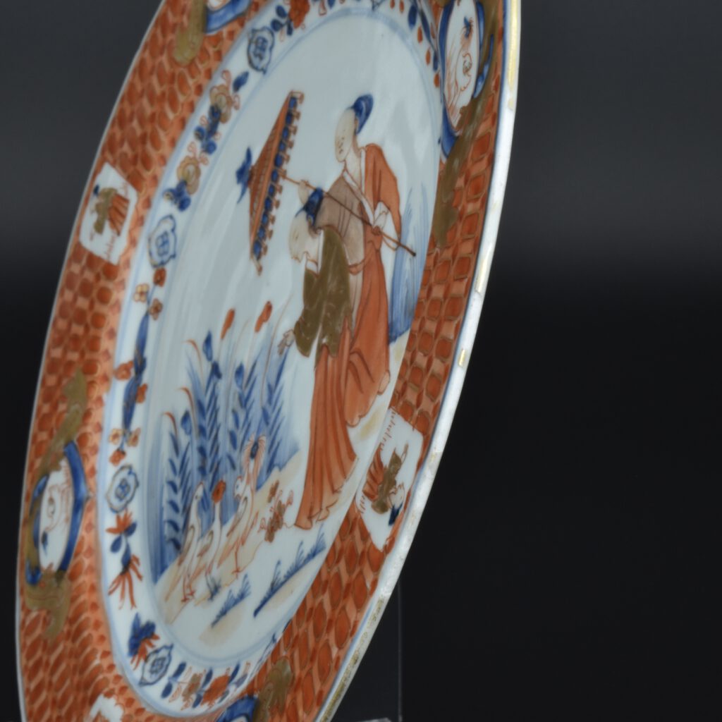 A Chinese Export Porcelain Imari Pronk’s Design ‘Parasoldames’, often referred to as La Dame au Parasol. This imari version of the well-known Chine de Commande design dates from about c.1736 to 1750, the pattern was used until at least 1760-1770. It is Chinoiserie in style, which is rather strange to the Chinese painting the design. These tall elegant ladies with their parasol must have seemed rather quaint and exotic to the Dutch middle and upper classes when they were first seen in the Netherlands. Cornelis Pronk also known as Cornelis Pronck, was a Dutch draughtsman, painter, and porcelain designer. He is known particularly for his numerous drawings of cities, towns, and buildings (topographical drawings), as well as for his porcelain designs. In 1734, as an experiment, the Dutch East India Company board, the Heren XVII, commissioned the Amsterdam artist Cornelis Pronk (1691-1759) to design depictions for services and other porcelains. He then designed a chinoiserie, a depiction in Chinese style, featuring a Chinese lady at the waterside and a female servant holding an umbrella. These drawings with the designs, which are now known as the Parasoldames (the parasol ladies) were sent to Batavia and from there to China, where porcelain, decorated after this example, was ordered in 1736. The coloured drawn plate design has been preserved and is now part of the collection of the Rijksmuseum Amsterdam. The High Government ordered porcelain conform to these drawings in both China and Japan.