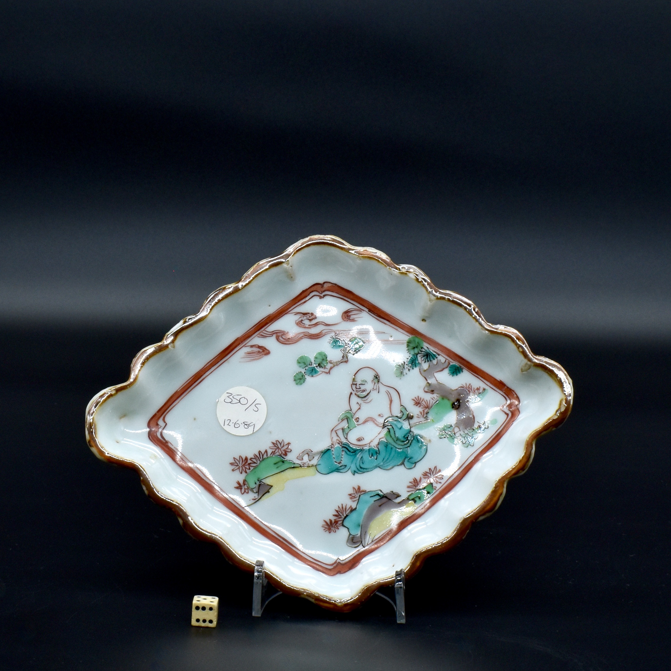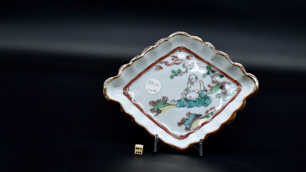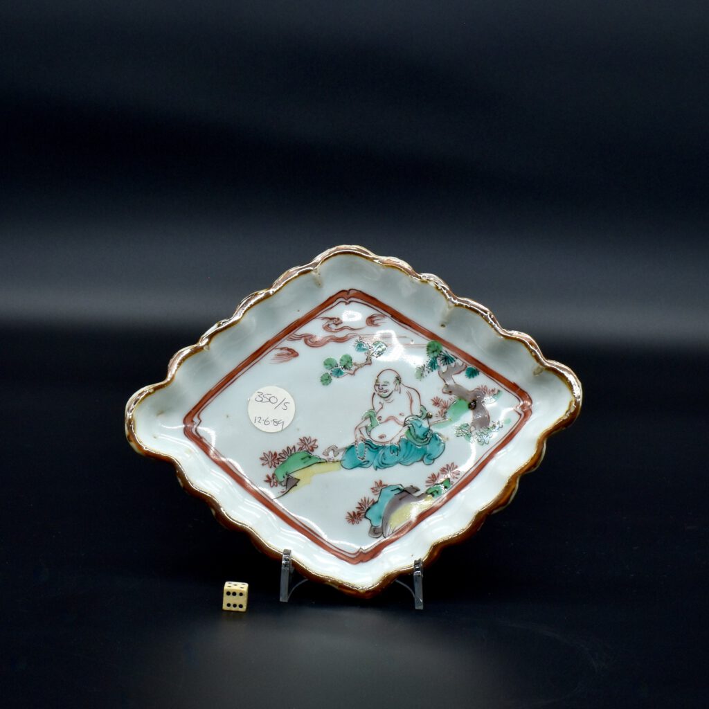 A Transitional Porcelain Ko-akai Enamelled Dish Made for the Japanese Market, Jingdezhen Kilns, Ming Dynasty, Chongzhen Period 1628 – 1644. This Ming dish Ko-akai Ming porcelain is thickly potted and so it is rather heavy. The dish was decorated in underglaze blue and fired, then it was enamelled and given its finial firing. The glaze is blue grey. This serving dish Mukozuke (literally meaning beyond server) was made in for the Kaiseki meal that accompanies the Japanese tea ceremony. Painted in underglaze cobalt blue with green, iron-red, and black. The central scene in the well depicts Budai (Hotei in Japanese), he is a Chinese deity. His name means `Cloth Sack` and comes from the bag that he carries. According to Chinese tradition, Budai was an eccentric Chinese Zen monk who lived during the 10th Century. Bearing in mind the long connection between Zen Buddhism and the Japanese tea ceremony, it is not surprising Budai takes center stage in this design. He sits on a fringed rug with the moon or sun above with pine and a cloud. Two phoenixes flank him, one of which has its head upside down. Below Budai are two ruyi-heads among stylised clouds. The border consists of two facing panels of flowering peony with orchid, the other two facing pales have a cartouche with flying phoenix against a red diaper ground. As with many pieces of Ming porcelain made for the Japanese market, this dish is deliberately made in a way that fits the Wabi-sabi aesthetic of delight in imperfection and accident. The shape is uneven, it is roughly made or should I say made with spirit and energy. The painting is free, there are imperfections such as tiny flecks of the iron red paint left on the surface. The back has allot of kiln grit within the footrim, the rim has been dressed with an iron oxide glaze.