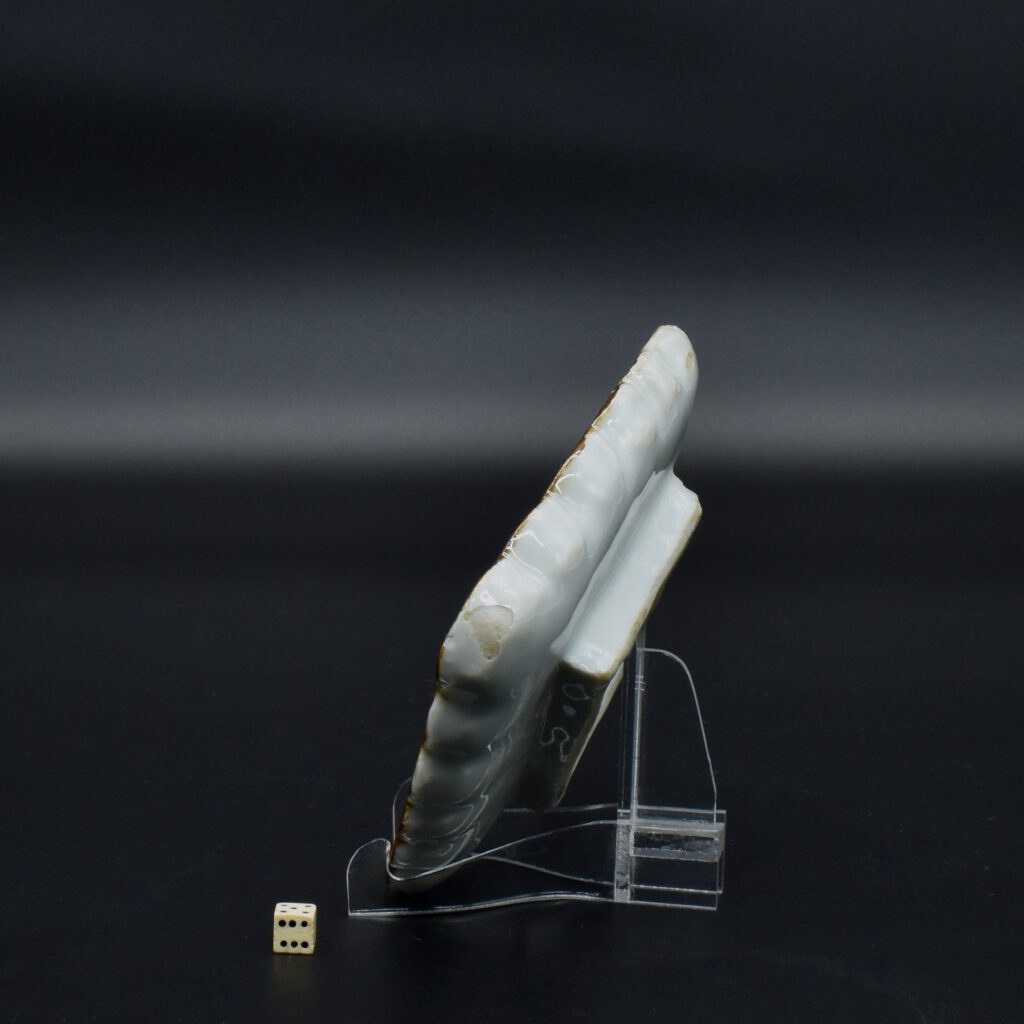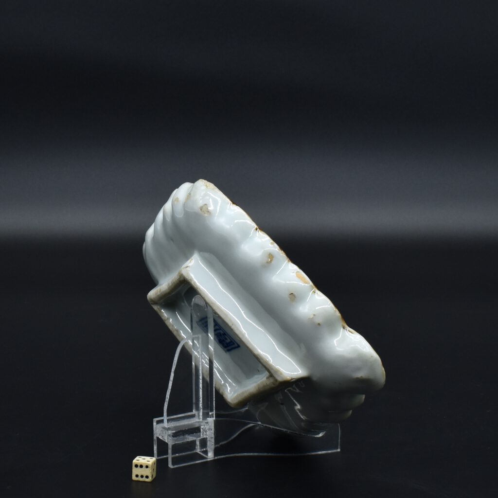 A Transitional Porcelain Dish Made for the Japanese Market, Jingdezhen Kilns, Ming Dynasty, Chongzhen Period 1628 – 1644. From The Peony Pavilion Collection (see Provenance). This late Ming dish Ko-akai porcelain dish is thickly potted and feels heavy in the hand. This serving dish Mukozuke (literally meaning beyond server) was made in for the Kaiseki meal that accompanies the Japanese tea ceremony. The back of this thickly potted Ming dish has a seal-mark, Wenguang meaning ‘literary lustre‘. The imperfections, including fritted Mushikui (insect-nibbled) rims, burst bubbles and kiln grit on the footrims all added to the Japanese aesthetic. These imperfections were something to be treasured by the Japanese, they reflect an imperfect world and the aesthetics of Wabi-Sabi. These ‘faults’ were an anathema to the Chinese, however they went along with it to satisfy the needs of their Japanese customers. The shapes created were often expressly made for the Japanese tea ceremony, especially the meal associated with tea drinking, the Kaiseki. The flat rim is dressed with an iron-oxide enamel, called 口紅 Fuchibeni in Japanese, meaning lipstick. It was used to frame ceramic designs but it also adds some strength to the fragile rim, as well as showing that the rim was not chipped. The word Fuchibeni, comes from kuchi meaning mouth and beni meaning red/safflower red.