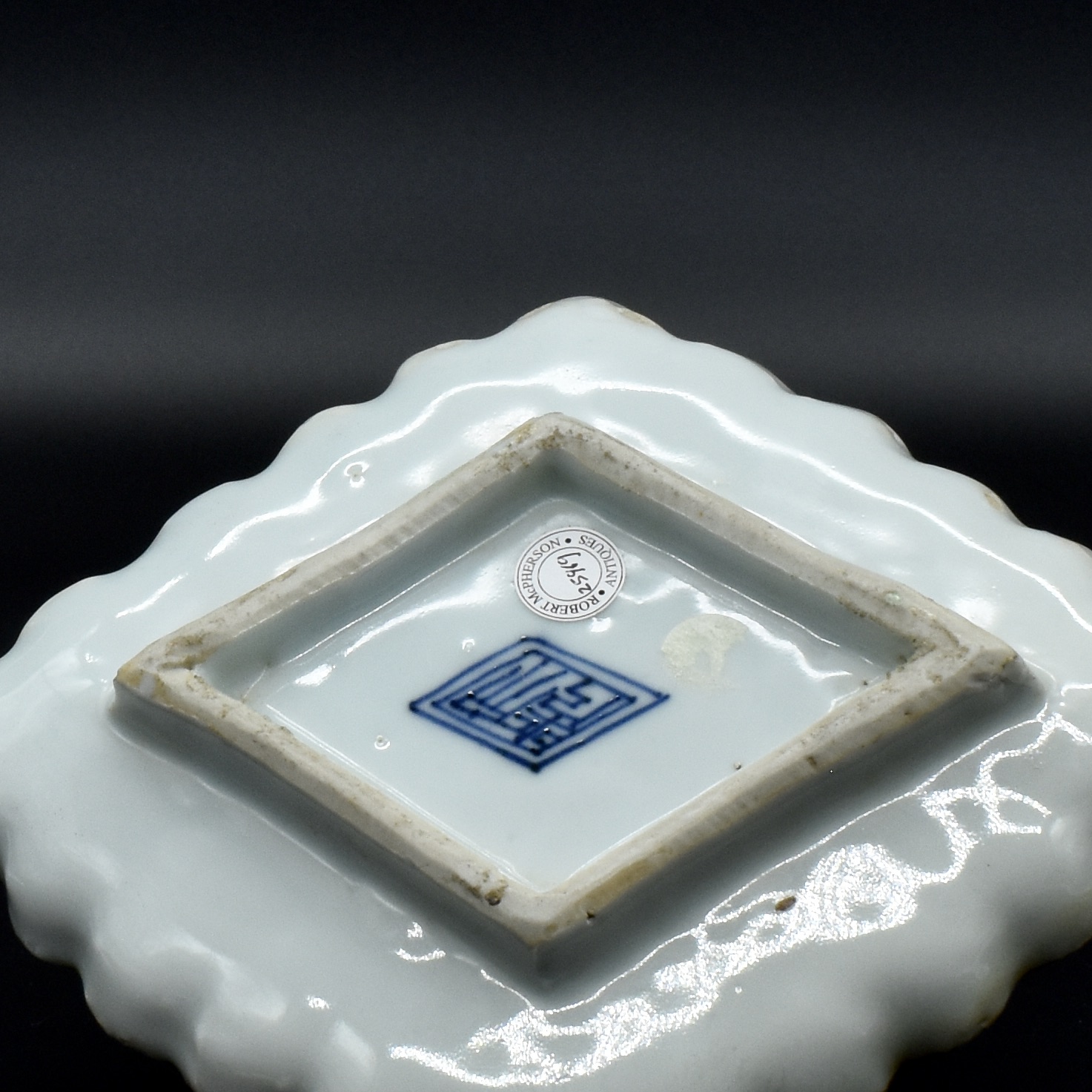 A Transitional Porcelain Dish Made for the Japanese Market, Jingdezhen Kilns, Ming Dynasty, Tianqi 1621 – 1628 or Chongzhen Period 1628 – 1644. This Ming porcelain Mukozuke (literally meaning beyond server) dish was made in for the Kaiseki meal that accompanies the Japanese tea ceremony. The hexagonal shallow form has indented corners with a flat broad rim painted in underglaze blue. This blue underglaze decoration is reminiscent of Kraak porcelain, this is perhaps unsurprising as Kraak ware was popular in 17th century Japan. Indeed, recent research has shown that some kilns in Jingdezhen produced porcelain for the Japanese market also made Kraak ware. The overglaze colours consist of a thickly applied translucent green enamel, a similar but paler green, there is also mustard yellow and aubergine. The red and black decoration is different, it sits flat on the surface of the porcelain, perhaps suggesting little or no glass binder was used. The central decoration depicts a pomegranate branch with three ripe pomegranates bursting open, their seeds of differing colours. A cicada and a grasshopper are feasting on the sweet open fruit. The cavetto has three cartouches decorated with flowering plants in enamel, colours set against a blue diaper patterns of cash (coins, meaning wealth), swastika (conducive to well-being) and a honeycomb design. The other three inverted triangular panels show a solitary seated figure on a promontory with a landscape in underglaze blue. Only one of the dishes from this group of six has an apocryphal Chenghua mark (Ming dynasty 1465-1487).