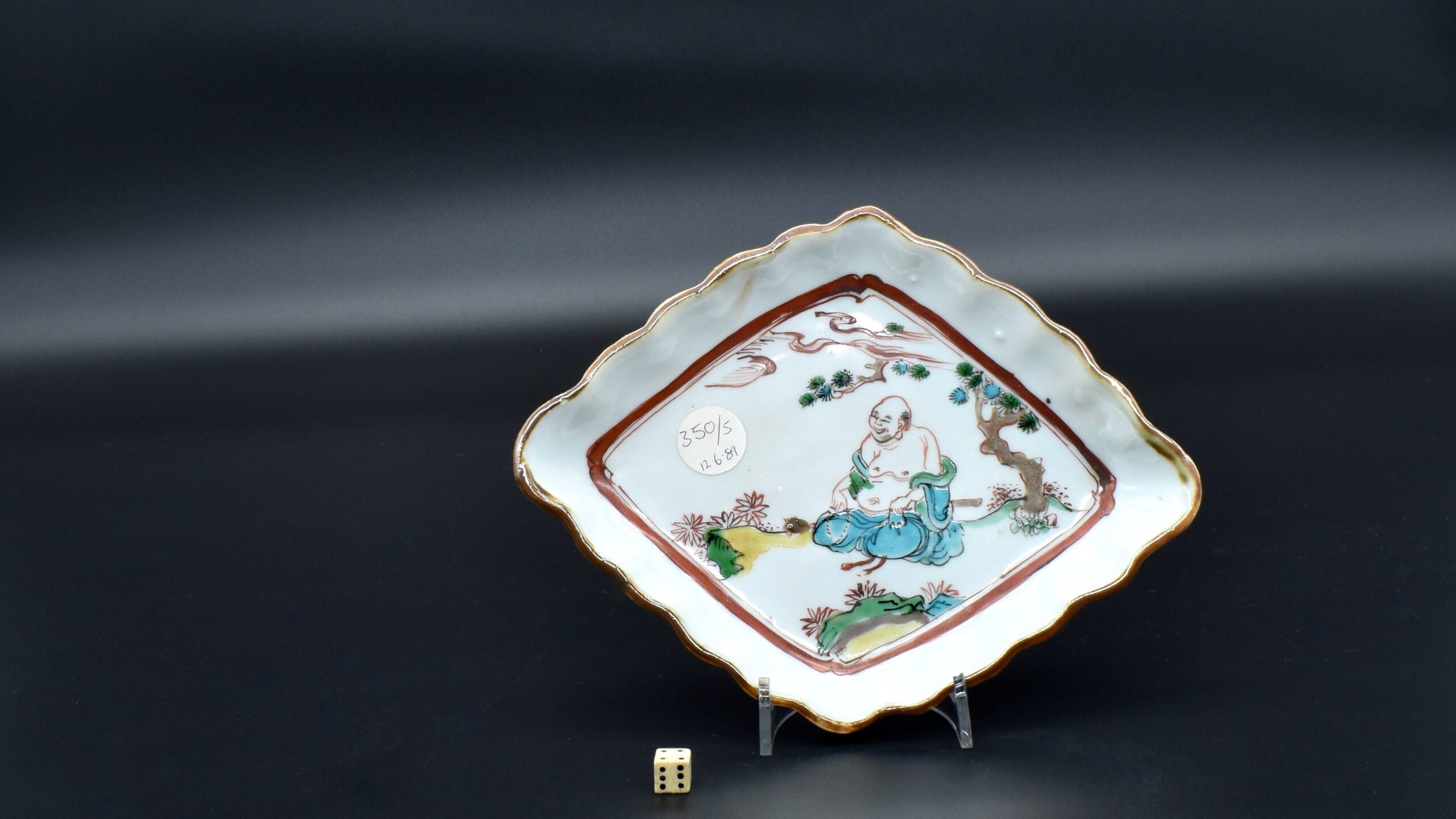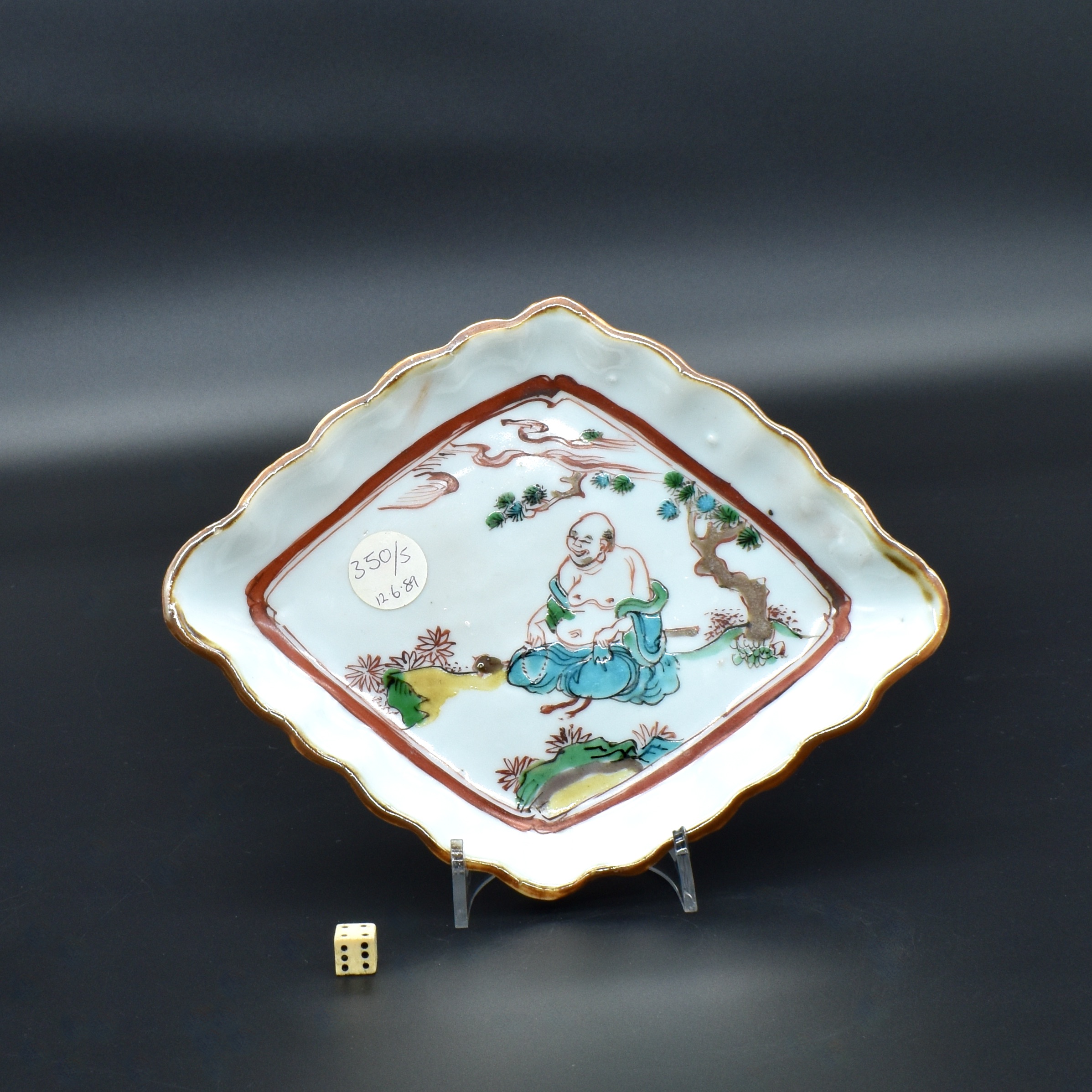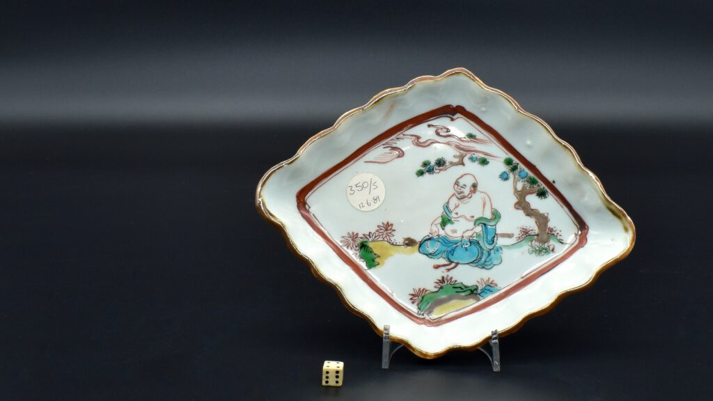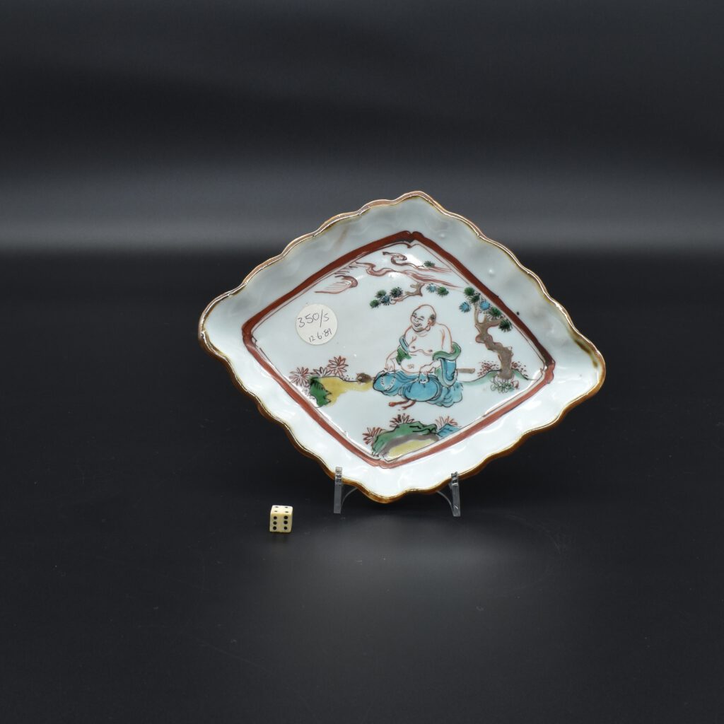 A Transitional Porcelain Ko-akai Enamelled Dish Made for the Japanese Market, Jingdezhen Kilns, Ming Dynasty, Chongzhen Period 1628 – 1644. This Ming dish Ko-akai Ming porcelain is thickly potted and so it is rather heavy. The dish was decorated in underglaze blue and fired, then it was enamelled and given its finial firing. The glaze is blue grey. This serving dish Mukozuke (literally meaning beyond server) was made in for the Kaiseki meal that accompanies the Japanese tea ceremony. Painted in underglaze cobalt blue with green, iron-red, and black. The central scene in the well depicts Budai (Hotei in Japanese), he is a Chinese deity. His name means `Cloth Sack` and comes from the bag that he carries. According to Chinese tradition, Budai was an eccentric Chinese Zen monk who lived during the 10th Century. Bearing in mind the long connection between Zen Buddhism and the Japanese tea ceremony, it is not surprising Budai takes center stage in this design. He sits on a fringed rug with the moon or sun above with pine and a cloud. Two phoenixes flank him, one of which has its head upside down. Below Budai are two ruyi-heads among stylised clouds. The border consists of two facing panels of flowering peony with orchid, the other two facing pales have a cartouche with flying phoenix against a red diaper ground. As with many pieces of Ming porcelain made for the Japanese market, this dish is deliberately made in a way that fits the Wabi-sabi aesthetic of delight in imperfection and accident. The shape is uneven, it is roughly made or should I say made with spirit and energy. The painting is free, there are imperfections such as tiny flecks of the iron red paint left on the surface. The back has allot of kiln grit within the footrim, the rim has been dressed with an iron oxide glaze.