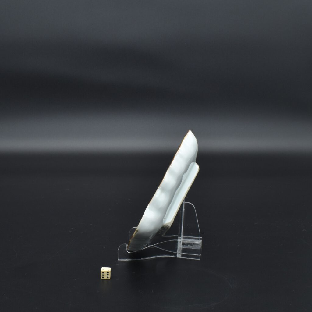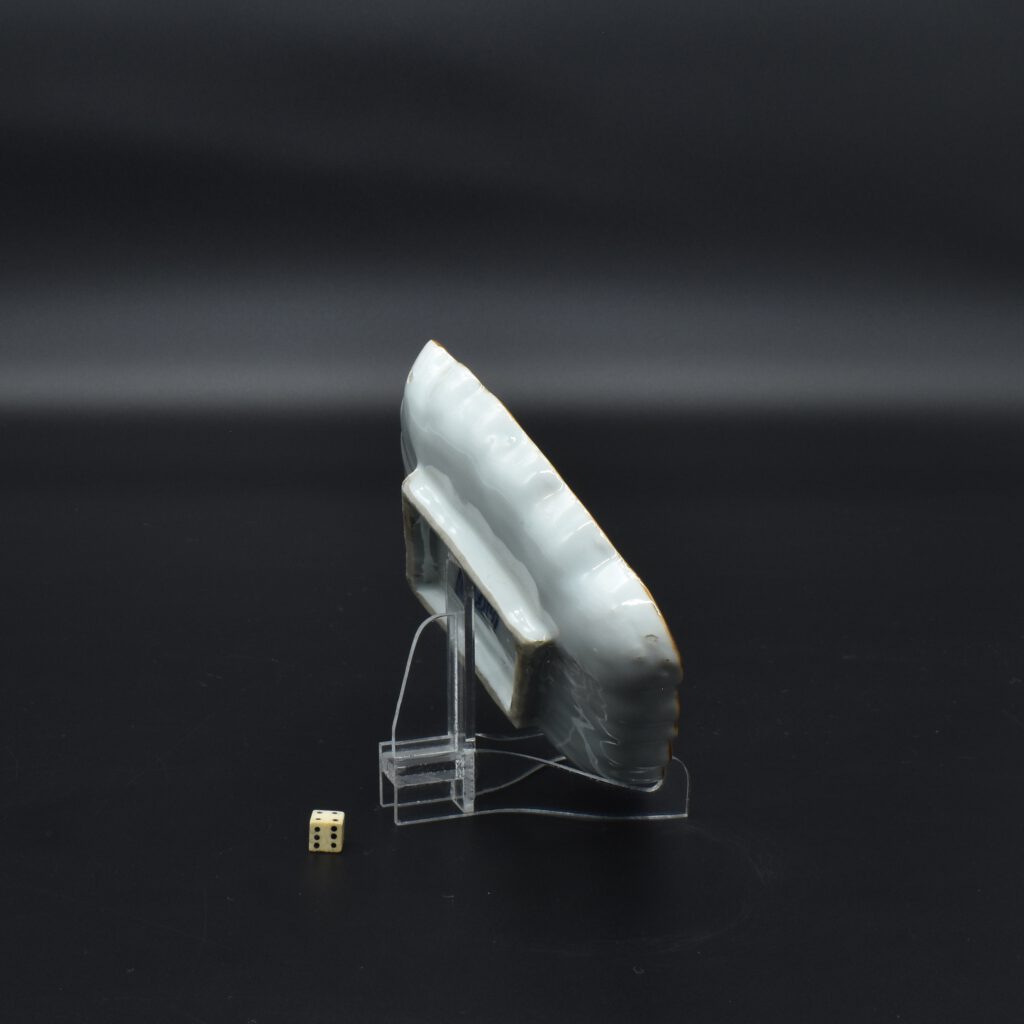A Transitional Porcelain Dish Made for the Japanese Market, Jingdezhen Kilns, Ming Dynasty, Chongzhen Period 1628 – 1644. From The Peony Pavilion Collection (see Provenance). This late Ming dish Ko-akai porcelain dish is thickly potted and feels heavy in the hand. This serving dish Mukozuke (literally meaning beyond server) was made in for the Kaiseki meal that accompanies the Japanese tea ceremony. The back of this thickly potted Ming dish has a seal-mark, Wenguang meaning ‘literary lustre‘. The imperfections, including fritted Mushikui (insect-nibbled) rims, burst bubbles and kiln grit on the footrims all added to the Japanese aesthetic. These imperfections were something to be treasured by the Japanese, they reflect an imperfect world and the aesthetics of Wabi-Sabi. These ‘faults’ were an anathema to the Chinese, however they went along with it to satisfy the needs of their Japanese customers. The shapes created were often expressly made for the Japanese tea ceremony, especially the meal associated with tea drinking, the Kaiseki. The flat rim is dressed with an iron-oxide enamel, called 口紅 Fuchibeni in Japanese, meaning lipstick. It was used to frame ceramic designs but it also adds some strength to the fragile rim, as well as showing that the rim was not chipped. The word Fuchibeni, comes from kuchi meaning mouth and beni meaning red/safflower red.