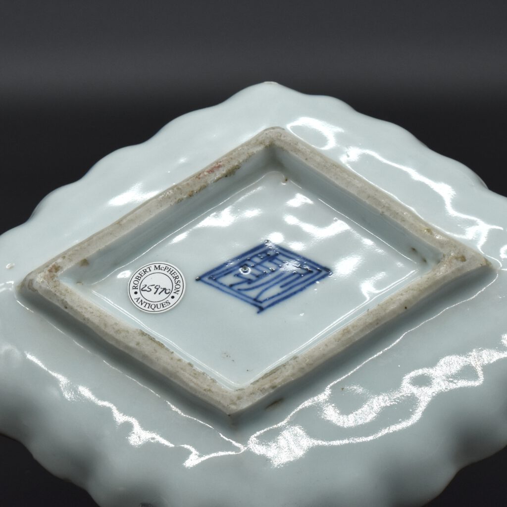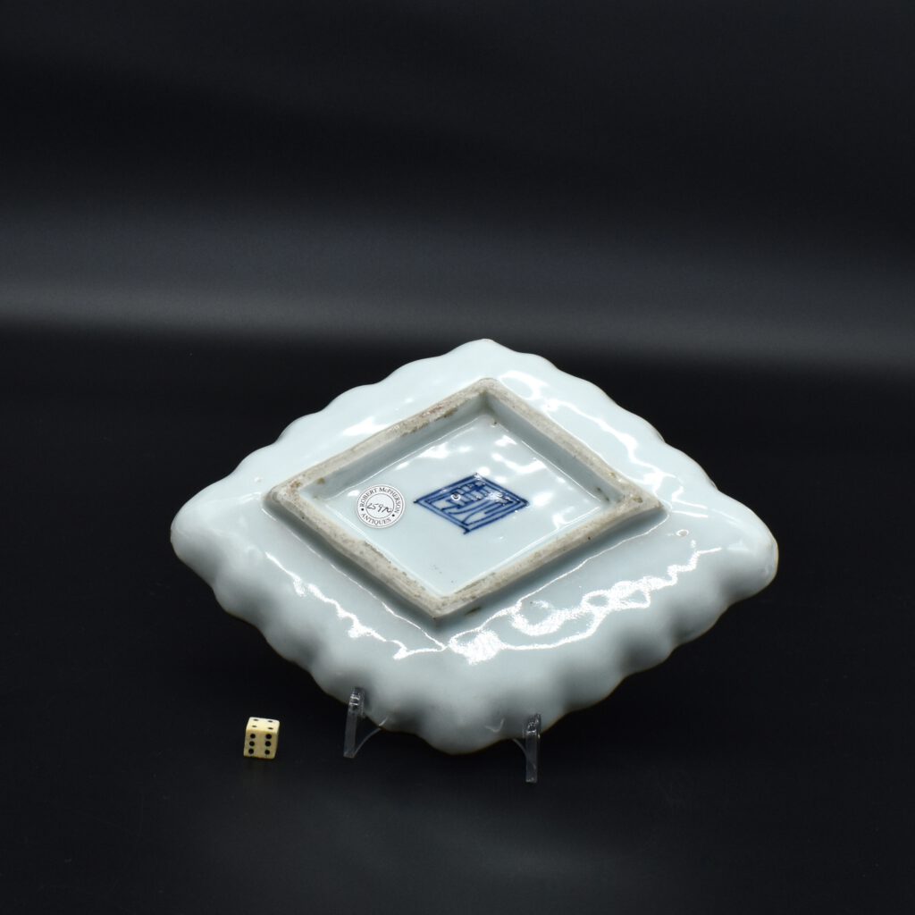 A Transitional Porcelain Dish Made for the Japanese Market, Jingdezhen Kilns, Ming Dynasty, Tianqi 1621 – 1628 or Chongzhen Period 1628 – 1644. This Ming porcelain Mukozuke (literally meaning beyond server) dish was made in for the Kaiseki meal that accompanies the Japanese tea ceremony. The hexagonal shallow form has indented corners with a flat broad rim painted in underglaze blue. This blue underglaze decoration is reminiscent of Kraak porcelain, this is perhaps unsurprising as Kraak ware was popular in 17th century Japan. Indeed, recent research has shown that some kilns in Jingdezhen produced porcelain for the Japanese market also made Kraak ware. The overglaze colours consist of a thickly applied translucent green enamel, a similar but paler green, there is also mustard yellow and aubergine. The red and black decoration is different, it sits flat on the surface of the porcelain, perhaps suggesting little or no glass binder was used. The central decoration depicts a pomegranate branch with three ripe pomegranates bursting open, their seeds of differing colours. A cicada and a grasshopper are feasting on the sweet open fruit. The cavetto has three cartouches decorated with flowering plants in enamel, colours set against a blue diaper patterns of cash (coins, meaning wealth), swastika (conducive to well-being) and a honeycomb design. The other three inverted triangular panels show a solitary seated figure on a promontory with a landscape in underglaze blue. Only one of the dishes from this group of six has an apocryphal Chenghua mark (Ming dynasty 1465-1487).