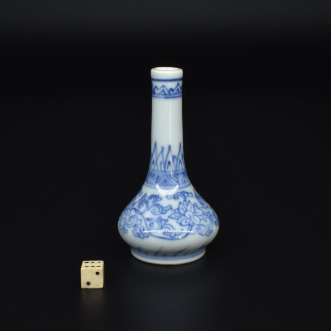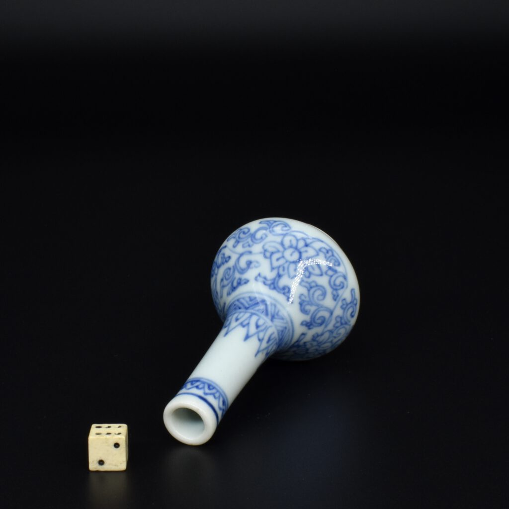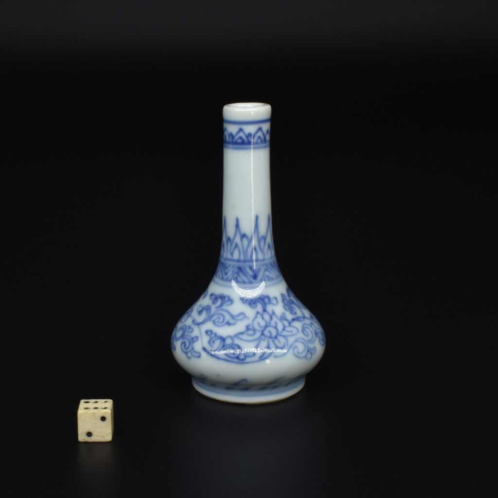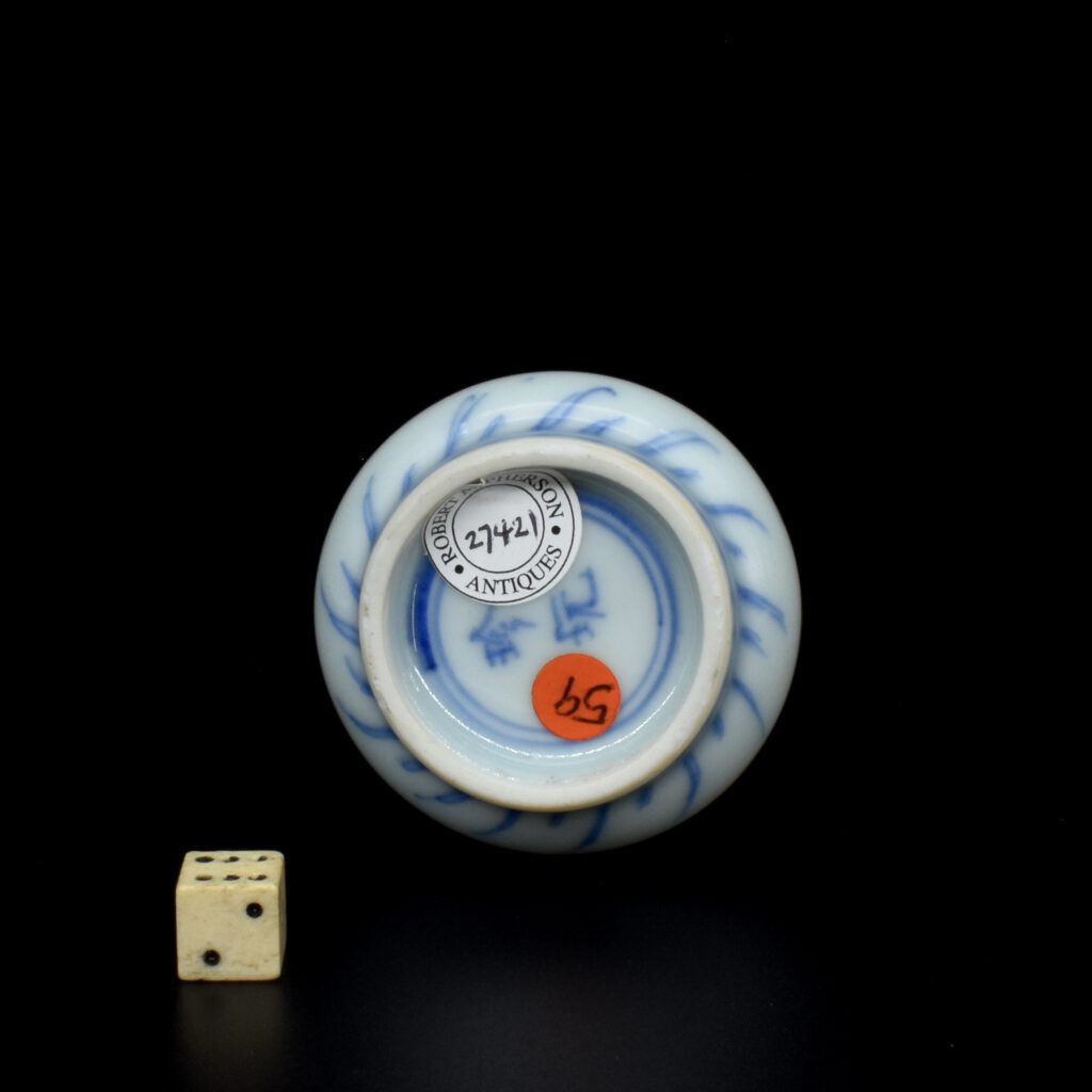 A Rare Miniature 17th Century Kangxi Blue and White Vase, Jingdezhen Kilns c.1670s. From the Collection of John Drew (1933 – 2006). This thickly potted Kangxi porcelain vase is decorated in what is referred to as the ‘pencil style’. This simply means the drawing is of fine lines, without infilling of tonal washes of cobalt blue. This rare vase is similar to miniature vases recovered from the Hatcher Cargo of c.1643 (two covers were recovered from the wreck with a cyclical date equivalent to 1643 were recovered). Most miniature Kangxi blue and white vases date from around 1700. For examples of the Hatcher vases of this type see ‘Information’ below. The two-character mark to the base can be translated as ‘Precious Trinket’, see The New & Revised Handbook of Marks on Chinese Ceramics’ by Gerald Davison (2010. ISBN 978-0-9564518-0-4) page 60, mark number 391.