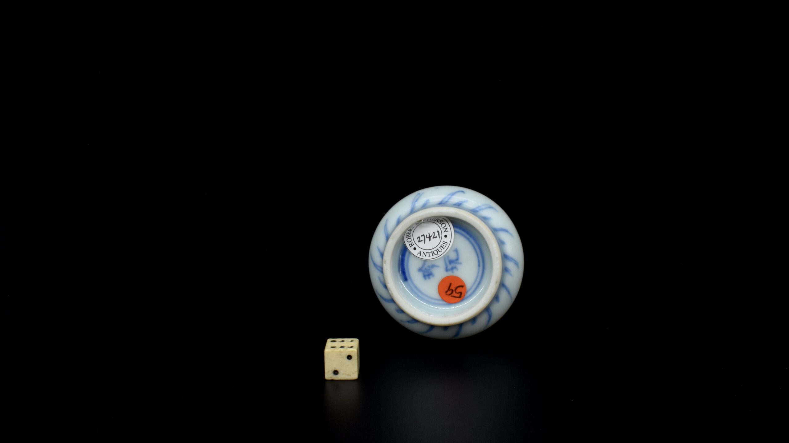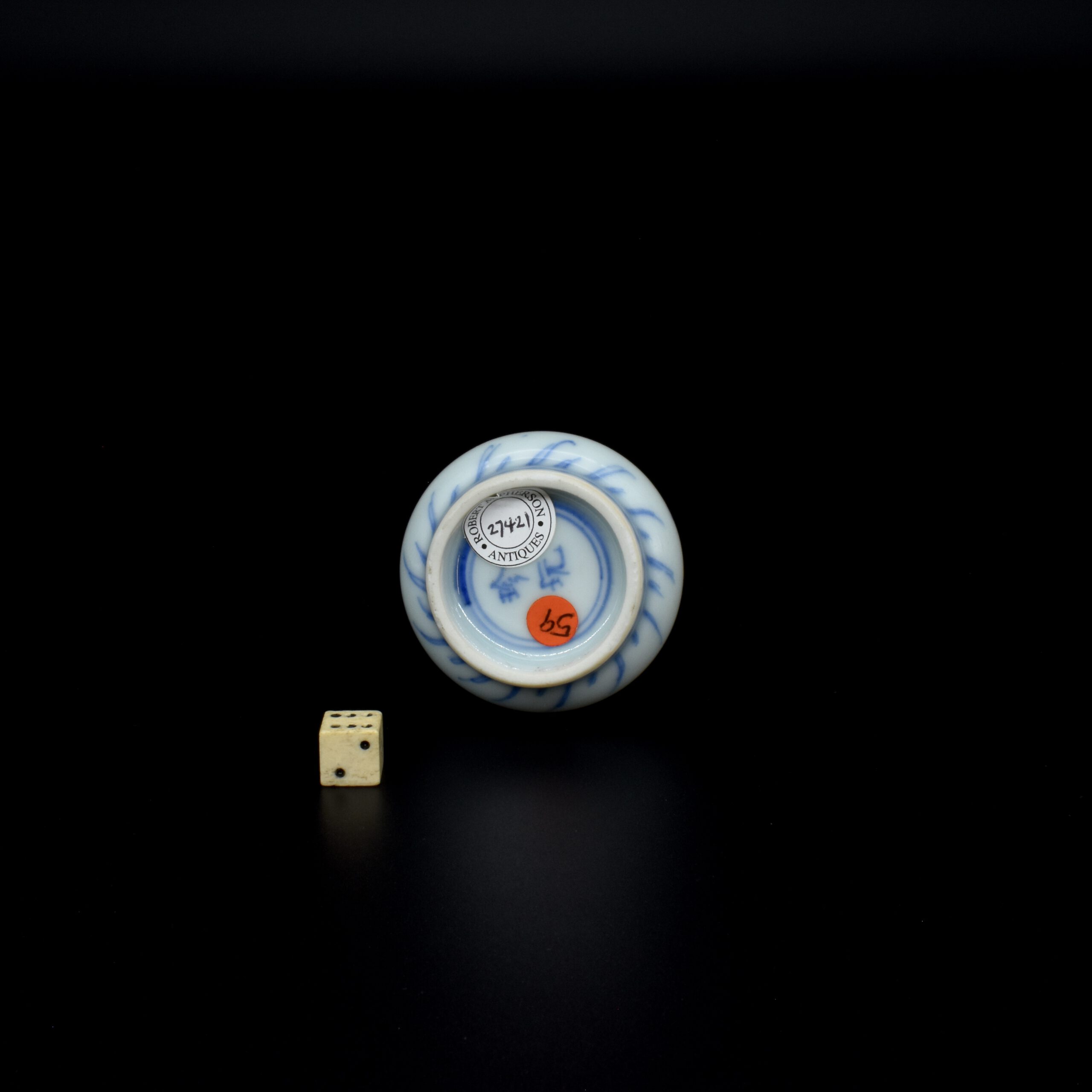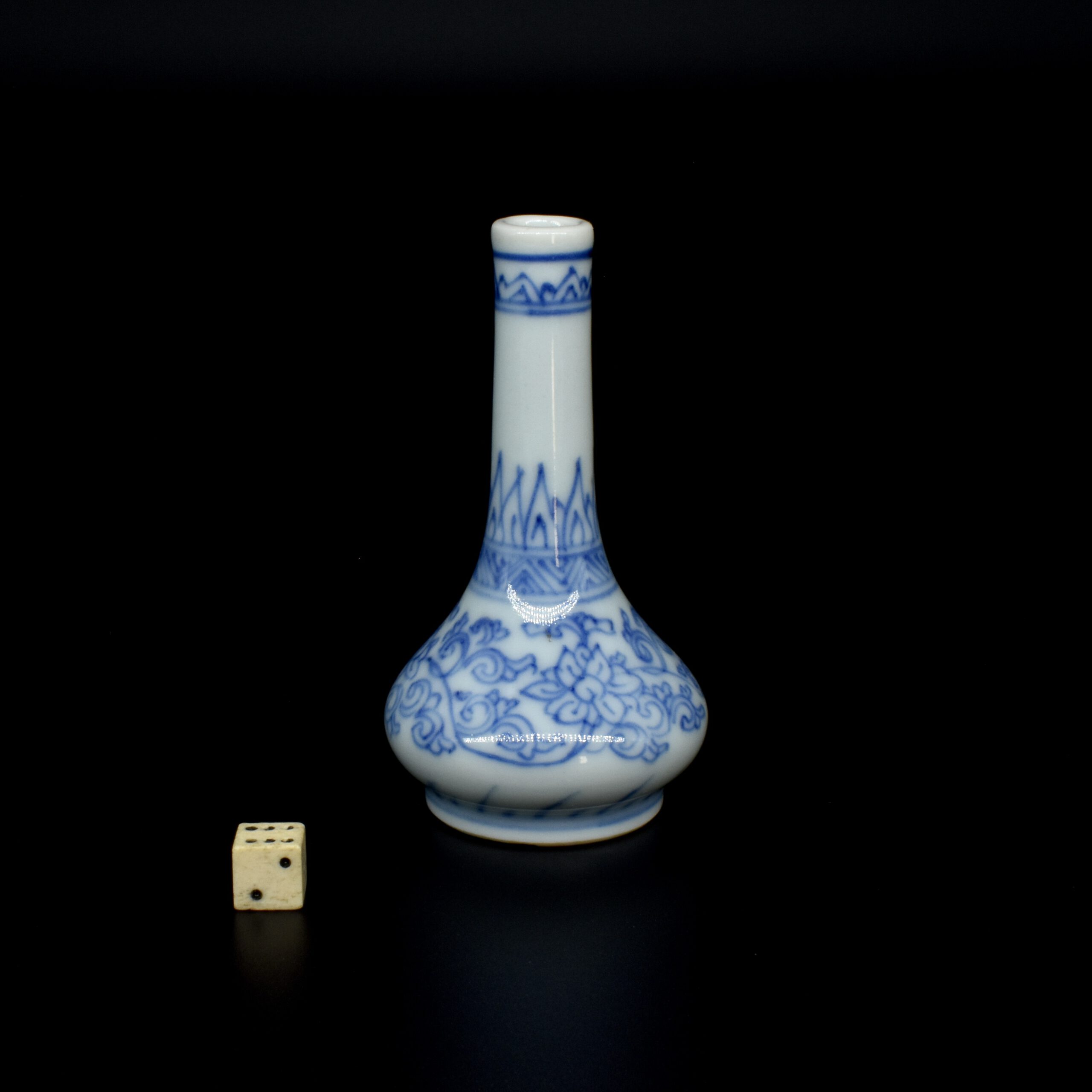 A Rare Miniature 17th Century Kangxi Blue and White Vase, Jingdezhen Kilns c.1670s. From the Collection of John Drew (1933 – 2006). This thickly potted Kangxi porcelain vase is decorated in what is referred to as the ‘pencil style’. This simply means the drawing is of fine lines, without infilling of tonal washes of cobalt blue. This rare vase is similar to miniature vases recovered from the Hatcher Cargo of c.1643 (two covers were recovered from the wreck with a cyclical date equivalent to 1643 were recovered). Most miniature Kangxi blue and white vases date from around 1700. For examples of the Hatcher vases of this type see ‘Information’ below. The two-character mark to the base can be translated as ‘Precious Trinket’, see The New & Revised Handbook of Marks on Chinese Ceramics’ by Gerald Davison (2010. ISBN 978-0-9564518-0-4) page 60, mark number 391.