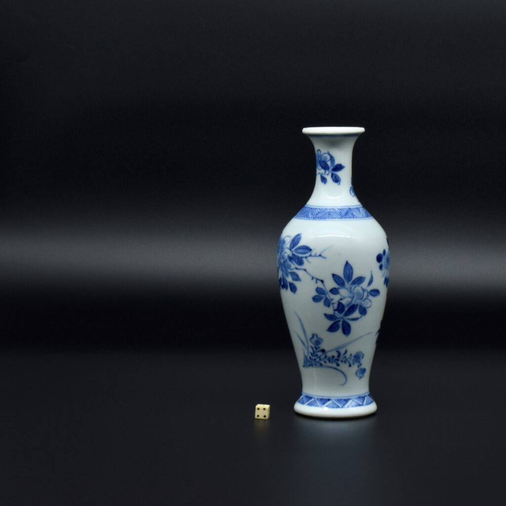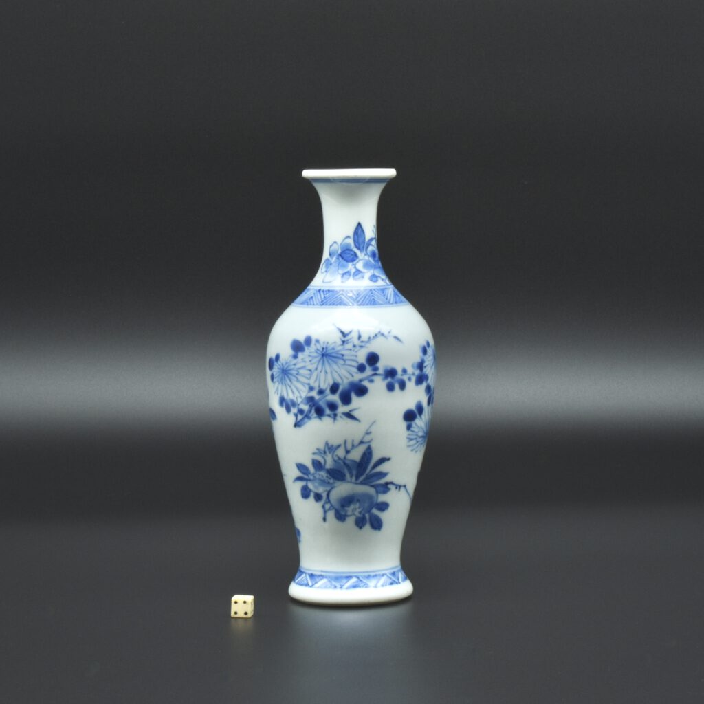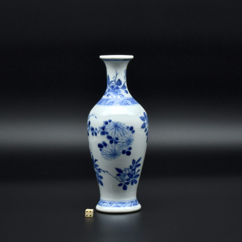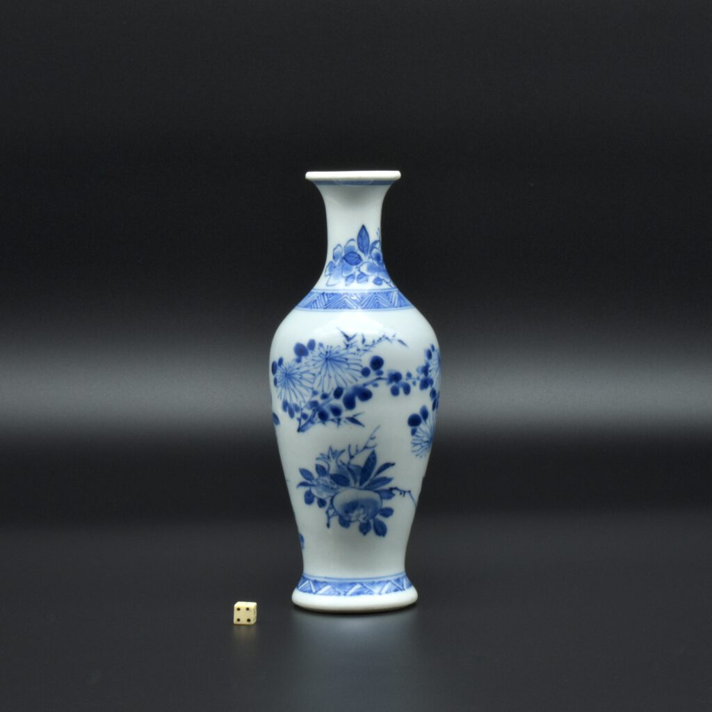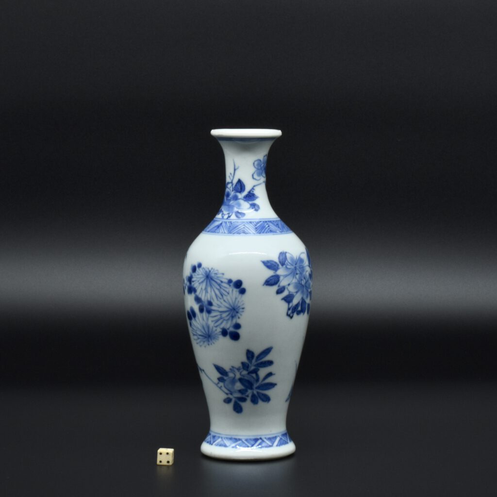 A Rare Early Kangxi Blue and White Porcelain Vase 1670s. From the Collection of John Drew (1933 – 2006). This elegantly potted vase is of an unusual form, and is rather heavily potted with a good balance visually and when held. This the subject matter is referred to as ‘fruit and flowers’. The painting is free, with swift confident brush strokes. The painter has using various techniques without resorting to outlines, including dots added with a wet brush, small spikey marks have been achieved with a flick of the wrist, creating small leaves and shoots. The chrysanthemum flowers are linear, with some of the outer petal ends not closed, a pale wash has been added to the center indicating density. The rather strong borders have been done in a pencilled technique, a similar technique has been employed to the pomegranate leaves. The dots added with a wet brush don’t have outlines, this type of decoration was rather charmingly referred to as “blobby dots” by Sir Michael Butler. This vase flower vase is of a form and decoration are very much the type of vase that would appeal to the Chinese. This could well have adorned a Chinese scholar’s desk. There is a two character mark to the deeply cut base, it can be translated as ‘Pure Trinket’. The translation is in ‘The New & Revised Handbook of Marks on Chinese Ceramics’ by Gerald Davison, see References.