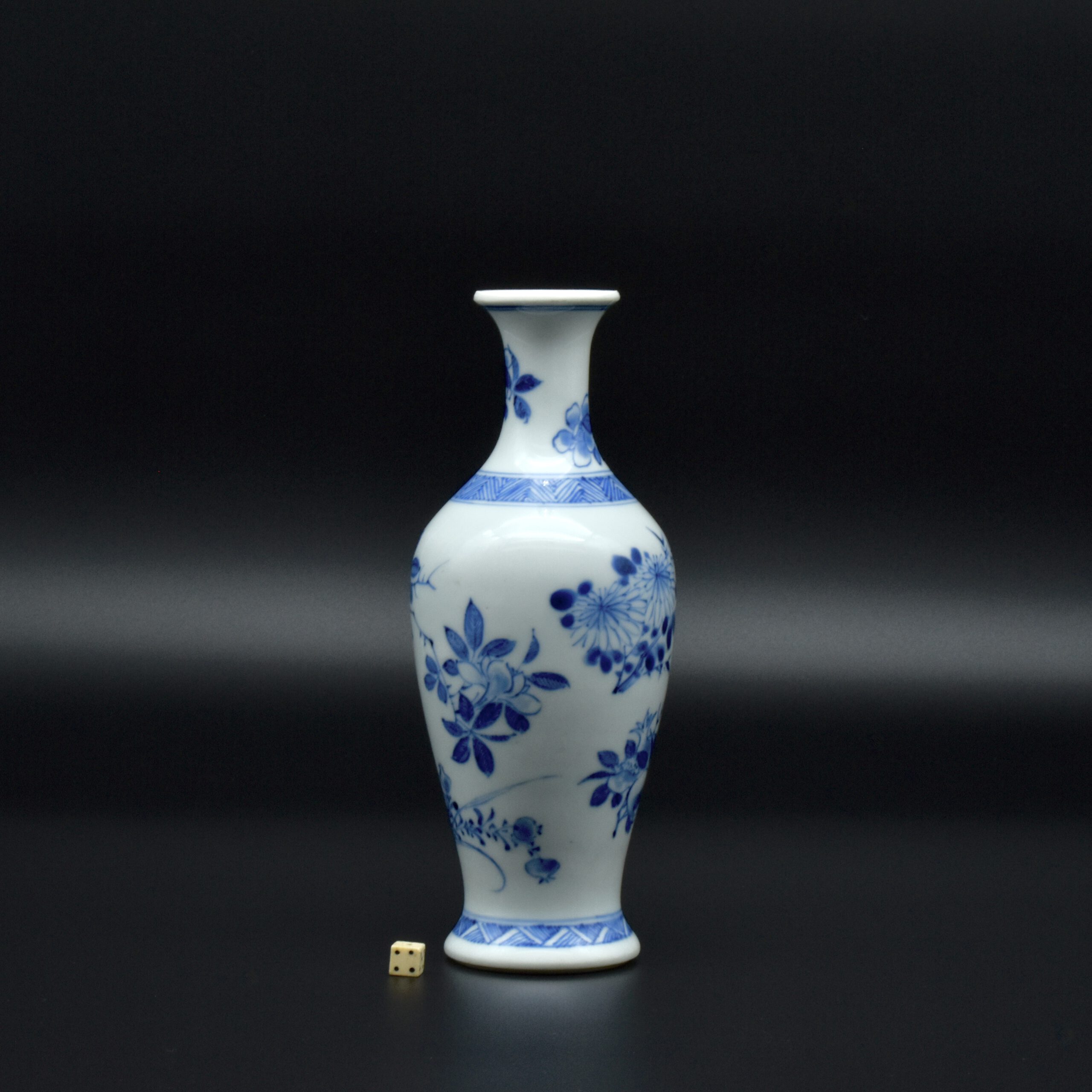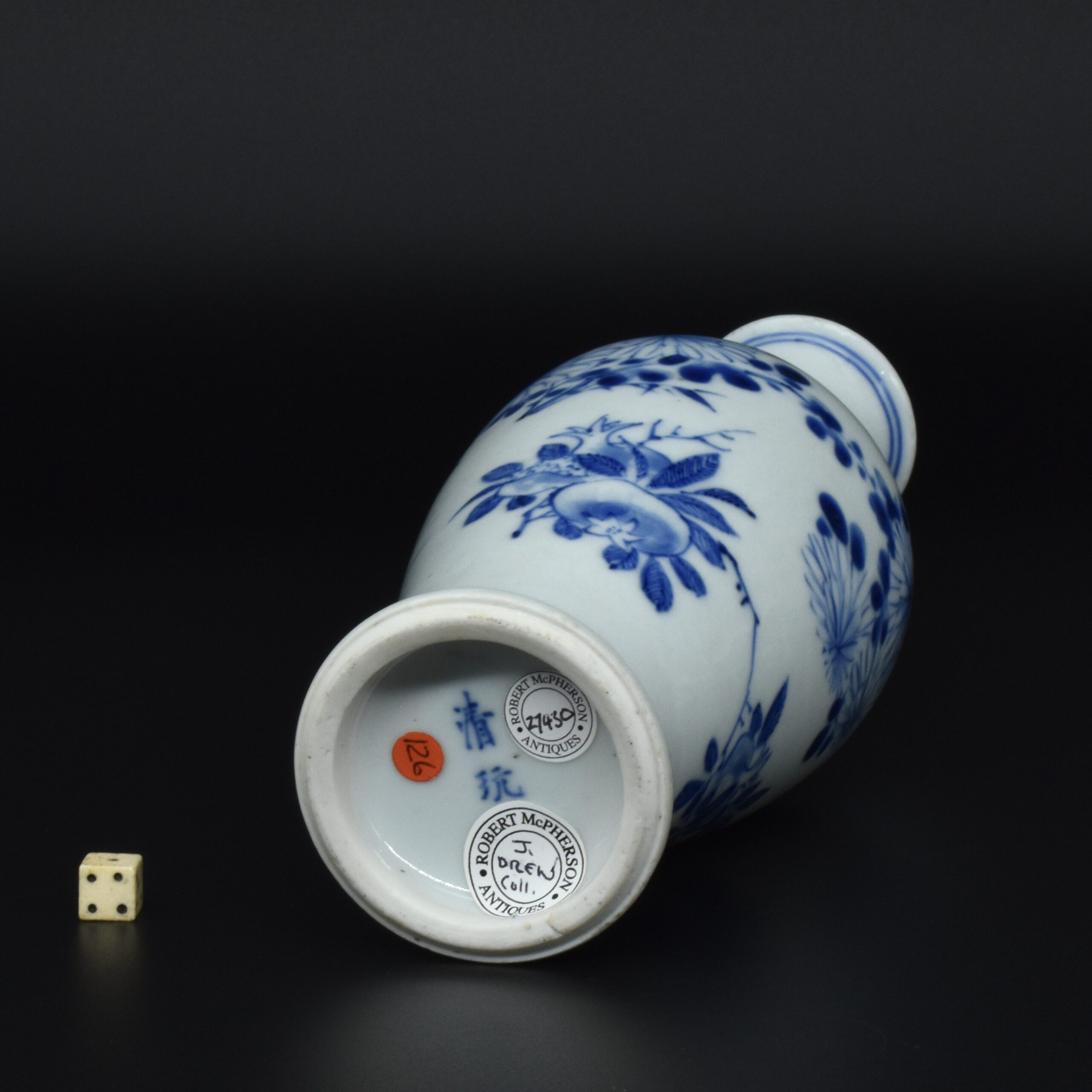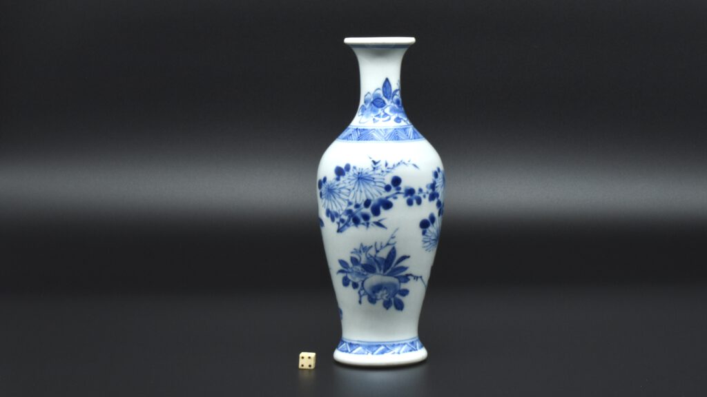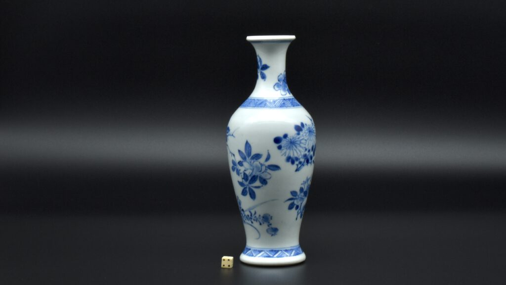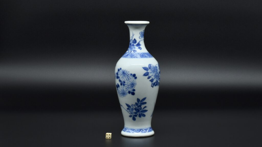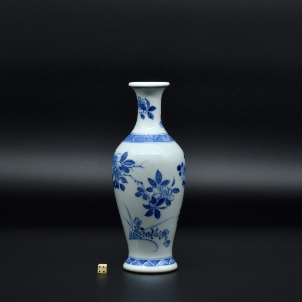 A Rare Early Kangxi Blue and White Porcelain Vase 1670s. From the Collection of John Drew (1933 – 2006). This elegantly potted vase is of an unusual form, and is rather heavily potted with a good balance visually and when held. This the subject matter is referred to as ‘fruit and flowers’. The painting is free, with swift confident brush strokes. The painter has using various techniques without resorting to outlines, including dots added with a wet brush, small spikey marks have been achieved with a flick of the wrist, creating small leaves and shoots. The chrysanthemum flowers are linear, with some of the outer petal ends not closed, a pale wash has been added to the center indicating density. The rather strong borders have been done in a pencilled technique, a similar technique has been employed to the pomegranate leaves. The dots added with a wet brush don’t have outlines, this type of decoration was rather charmingly referred to as “blobby dots” by Sir Michael Butler. This vase flower vase is of a form and decoration are very much the type of vase that would appeal to the Chinese. This could well have adorned a Chinese scholar’s desk. There is a two character mark to the deeply cut base, it can be translated as ‘Pure Trinket’. The translation is in ‘The New & Revised Handbook of Marks on Chinese Ceramics’ by Gerald Davison, see References.