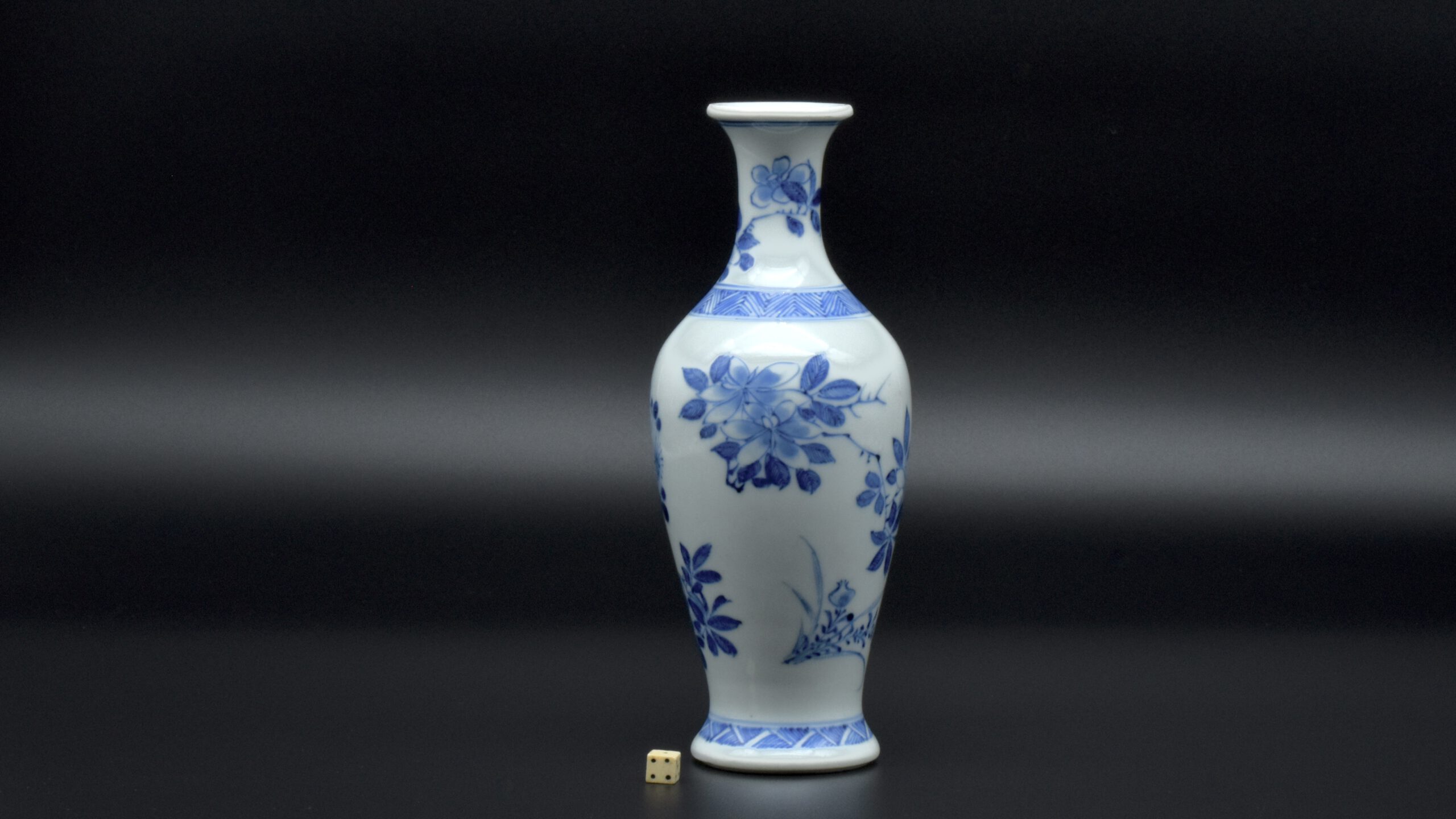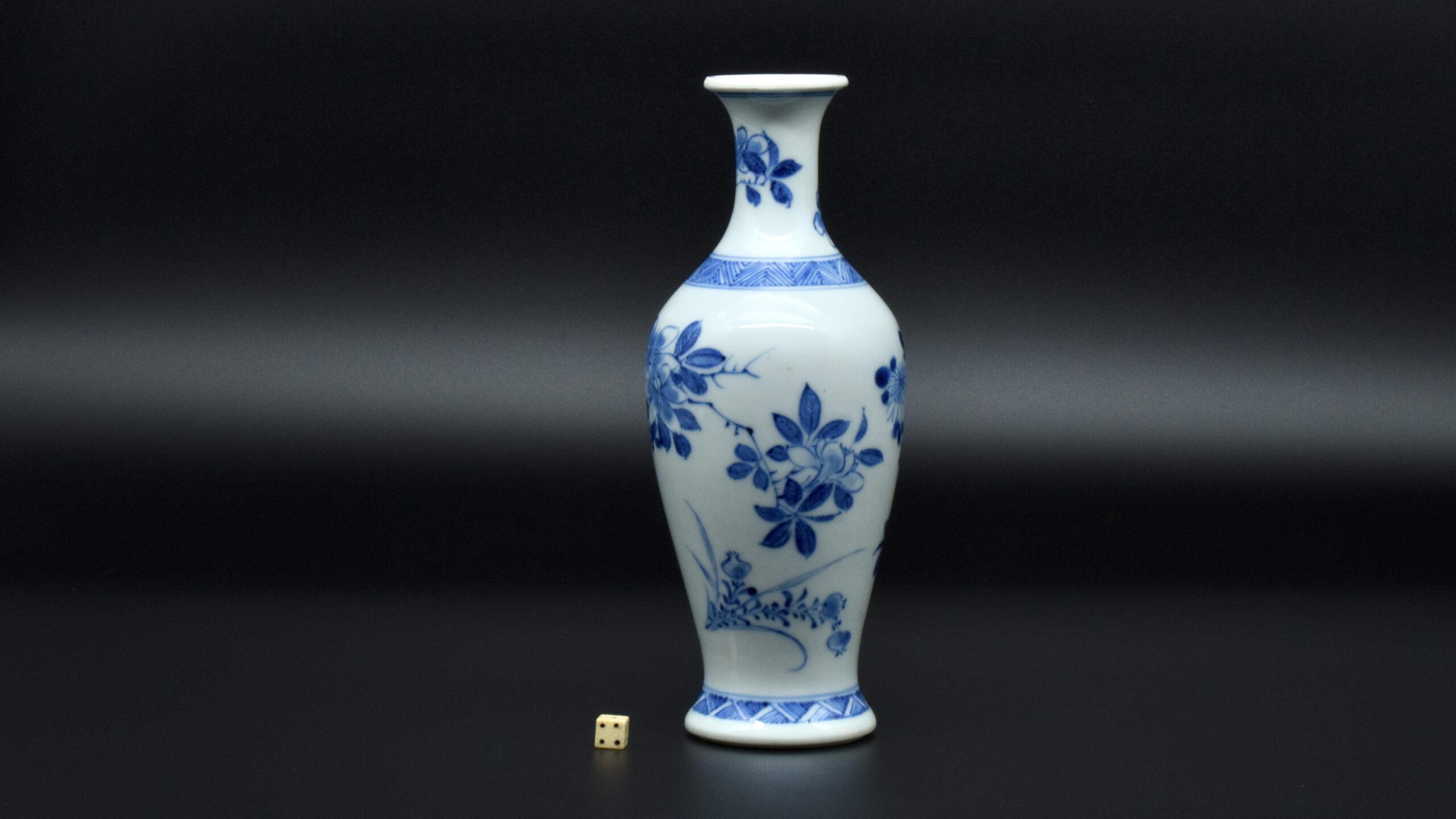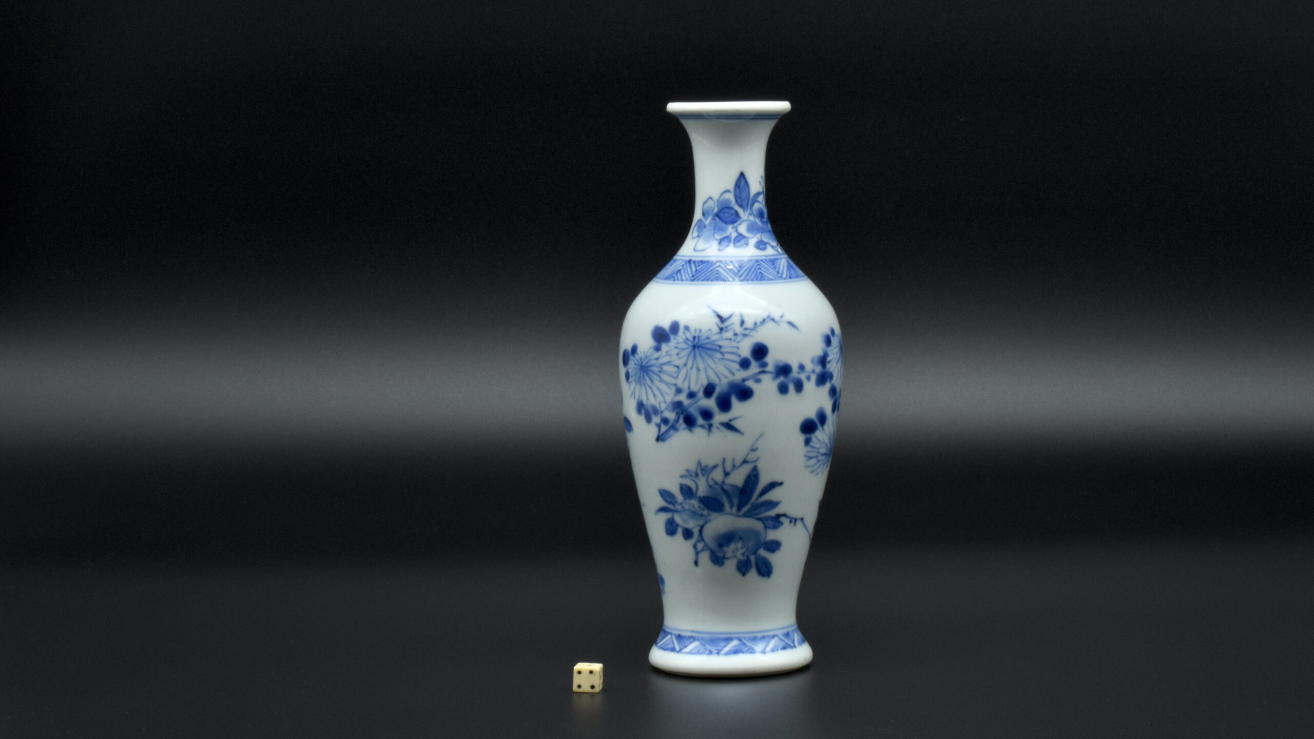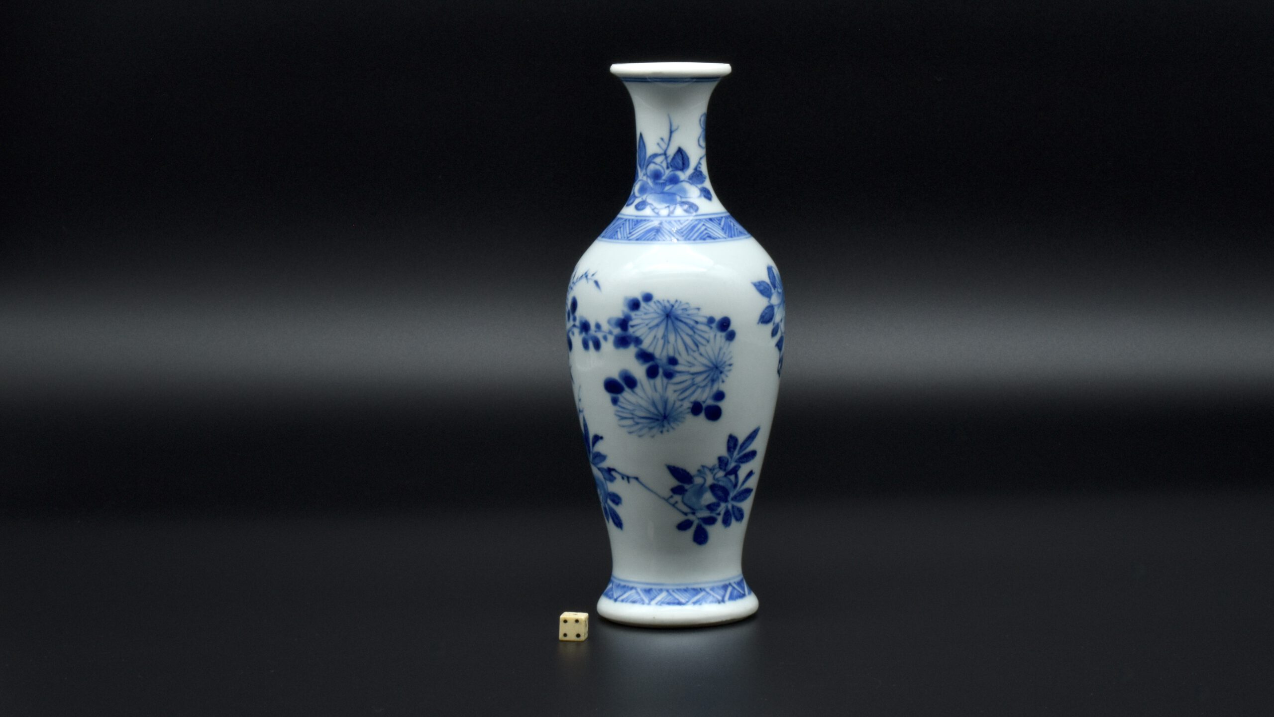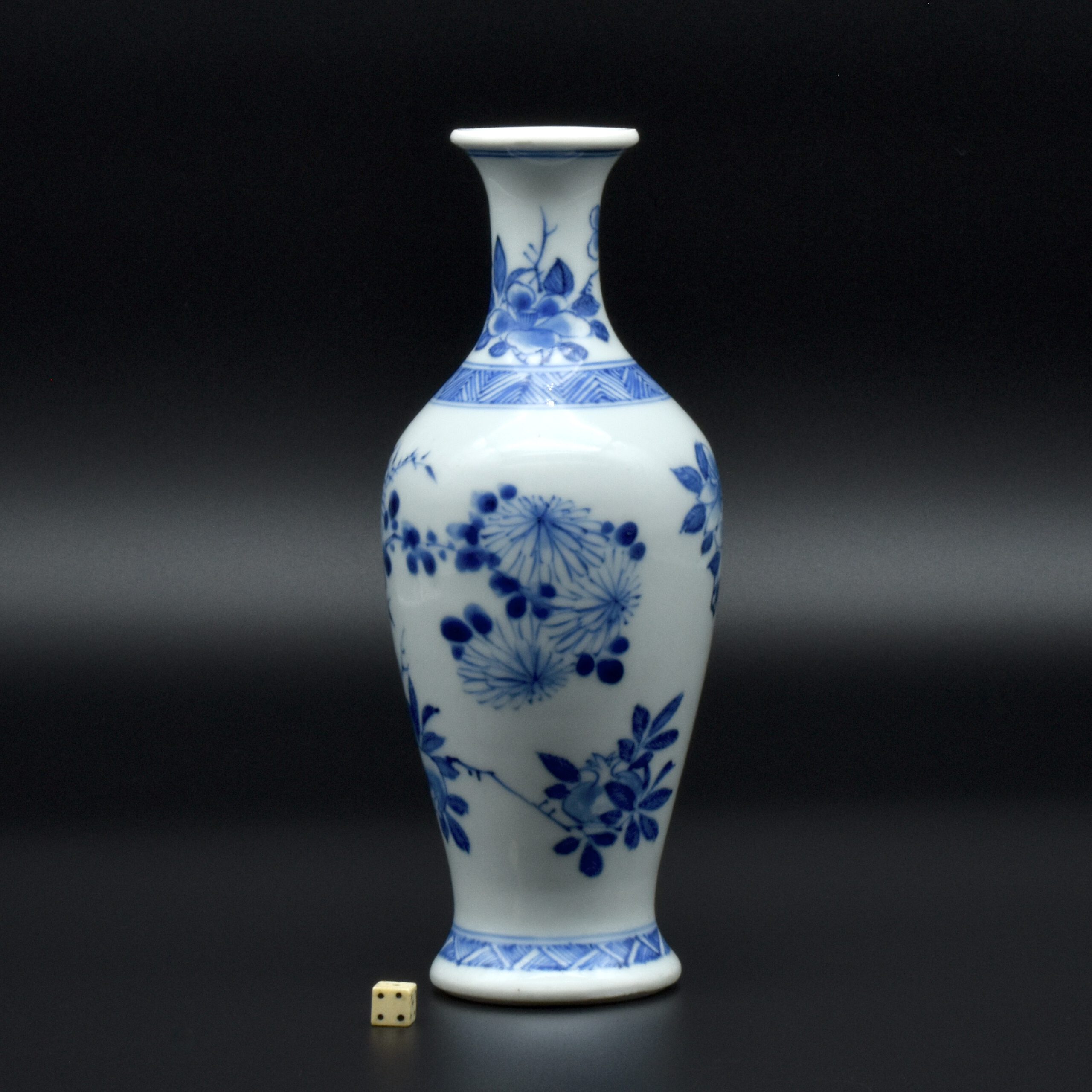 A Rare Early Kangxi Blue and White Porcelain Vase 1670s. From the Collection of John Drew (1933 – 2006). This elegantly potted vase is of an unusual form, and is rather heavily potted with a good balance visually and when held. This the subject matter is referred to as ‘fruit and flowers’. The painting is free, with swift confident brush strokes. The painter has using various techniques without resorting to outlines, including dots added with a wet brush, small spikey marks have been achieved with a flick of the wrist, creating small leaves and shoots. The chrysanthemum flowers are linear, with some of the outer petal ends not closed, a pale wash has been added to the center indicating density. The rather strong borders have been done in a pencilled technique, a similar technique has been employed to the pomegranate leaves. The dots added with a wet brush don’t have outlines, this type of decoration was rather charmingly referred to as “blobby dots” by Sir Michael Butler. This vase flower vase is of a form and decoration are very much the type of vase that would appeal to the Chinese. This could well have adorned a Chinese scholar’s desk. There is a two character mark to the deeply cut base, it can be translated as ‘Pure Trinket’. The translation is in ‘The New & Revised Handbook of Marks on Chinese Ceramics’ by Gerald Davison, see References.