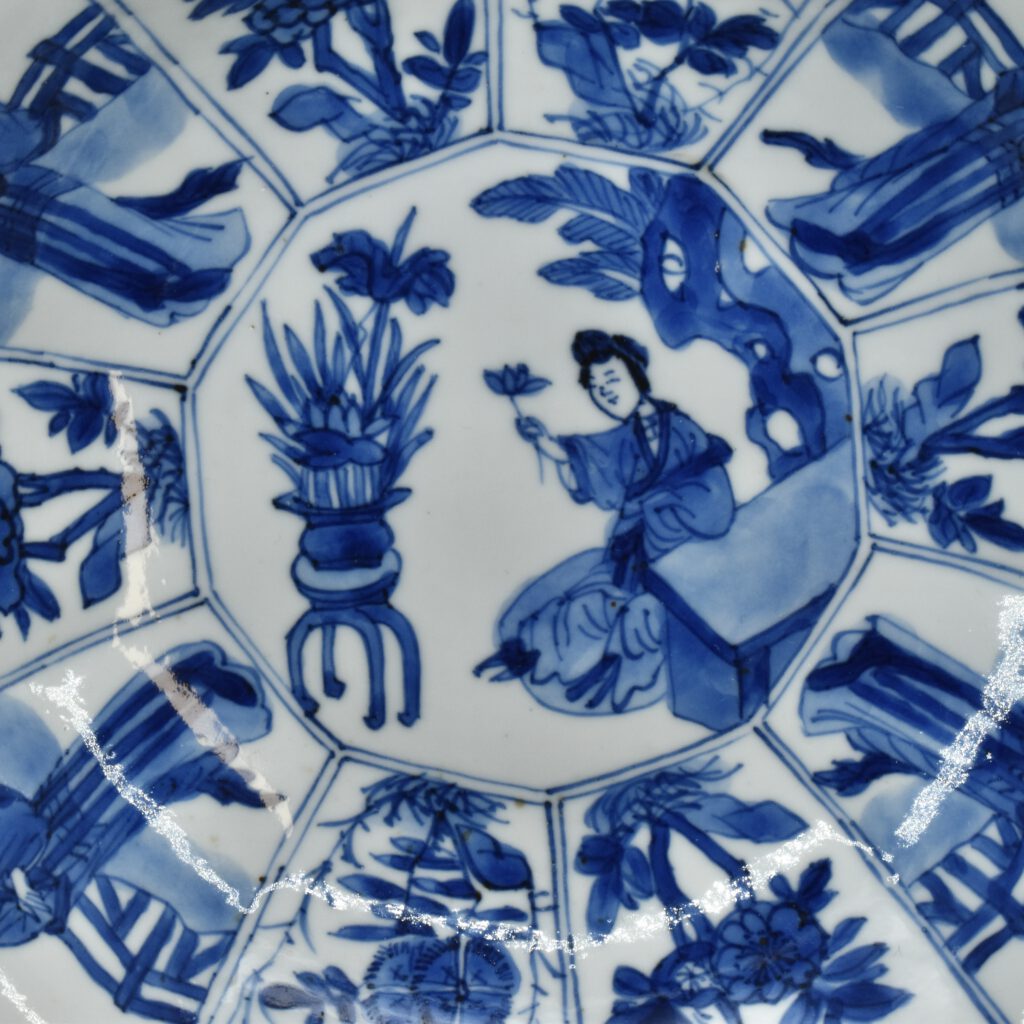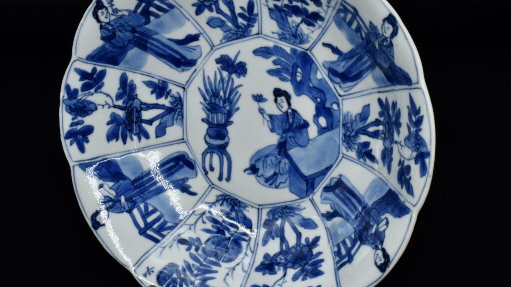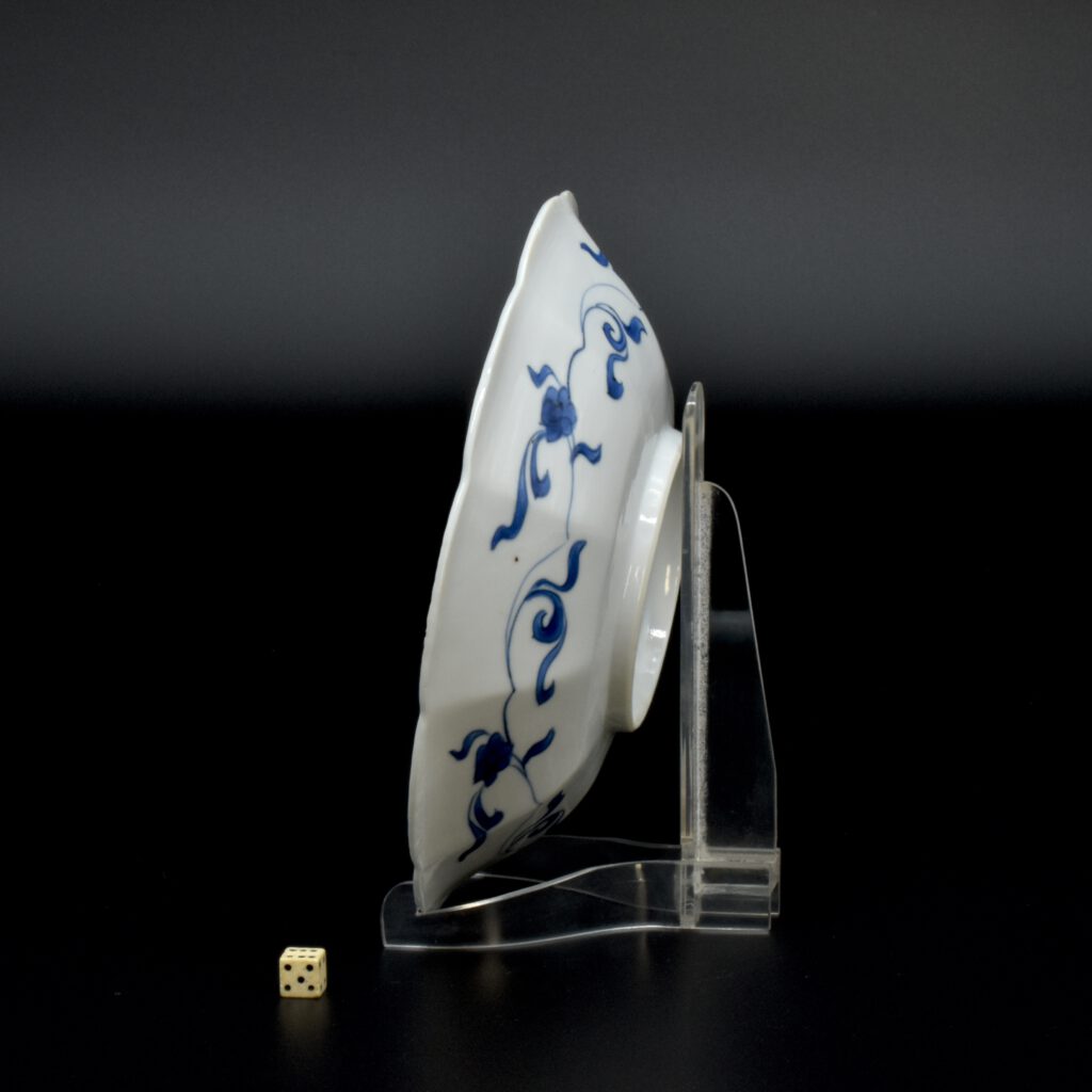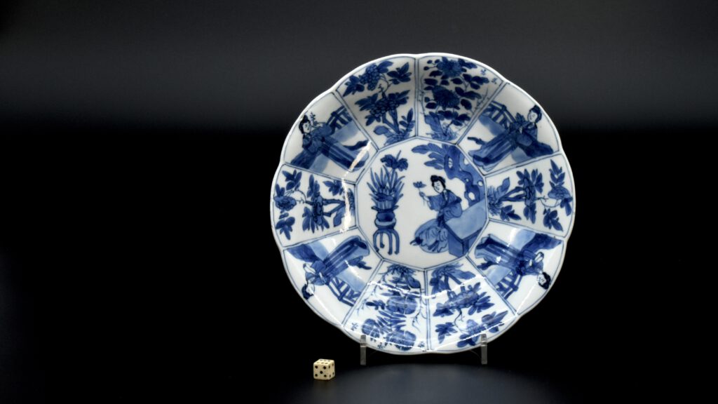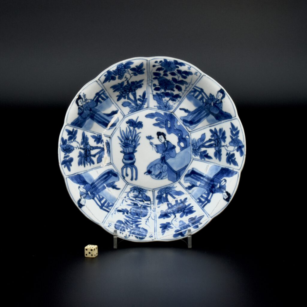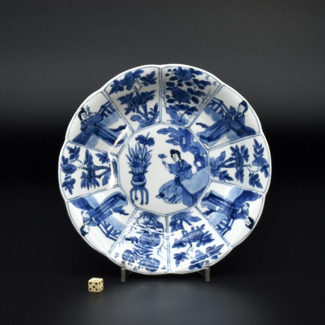 A Small Kangxi Blue and White Porcelain Flower Form Dish, Jingdezhen Kilns, c.1700. From the Collection of John Drew (1933 – 2006). This Kangxi porcelain dish was moulded to mimic the shape of a flower, the petal shaped panels are decorated with Lange Lyzen (Long Eliza in English), divided by two pairs of panels and two single panels of flowering plants. The plants include Dianthus chinensis referred to as a pink, peony, chrysanthemum. The central panel depicts a Lange Lyzen at a table with a table holding a lotus that was perhaps picked from the lotus display tin the jardiniere next to her. Small blue and white Chinese porcelain dishes, like the present Kangxi example, were very popular with the Dutch middle and upper classes at this time. In the Netherlands the thin elegant ladies were referred to as Lange Lyzen, and in England as `Long Eliza`. The base has the character 玉 pronounced Yu, meaning jade. The Chinese have a ranking system of materials, with jade being the highest of all materials.