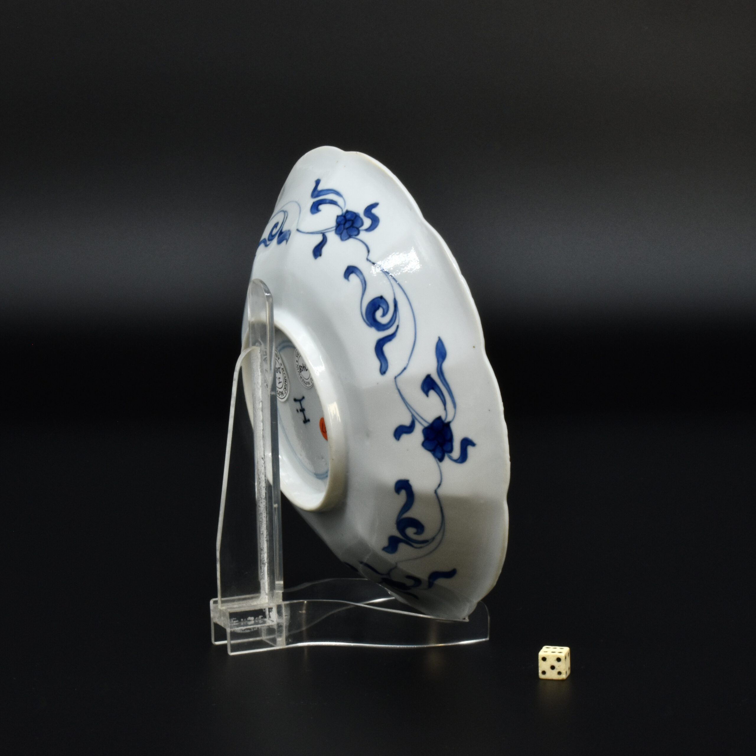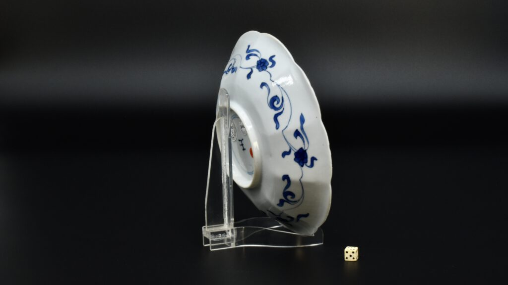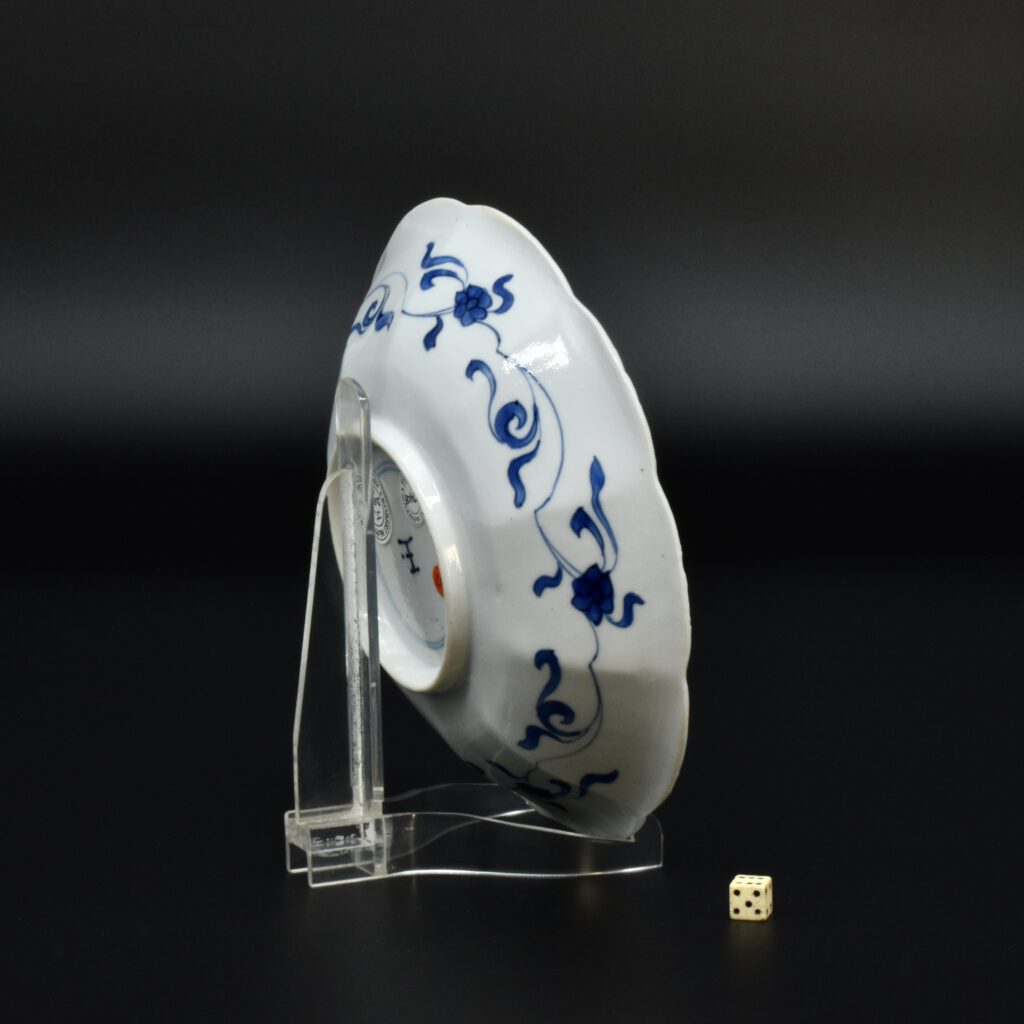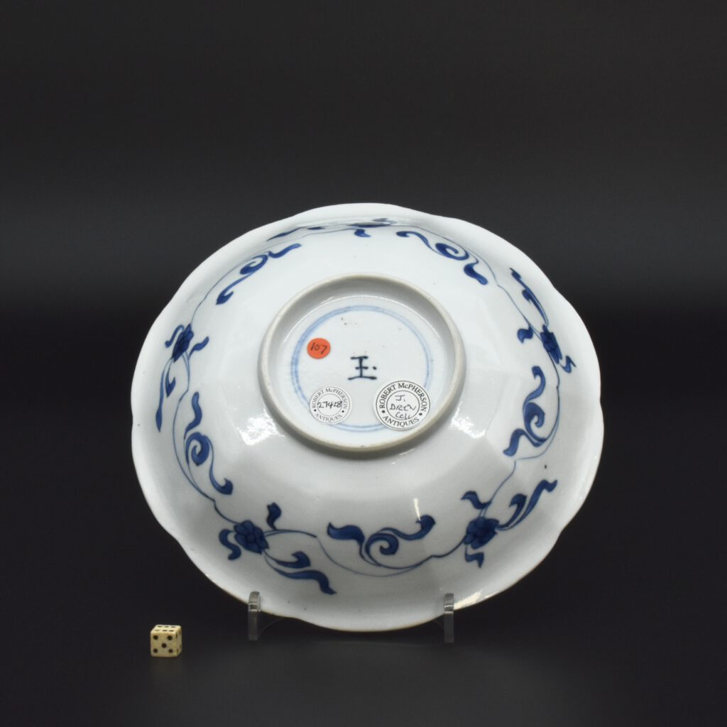 A Small Kangxi Blue and White Porcelain Flower Form Dish, Jingdezhen Kilns, c.1700. From the Collection of John Drew (1933 – 2006). This Kangxi porcelain dish was moulded to mimic the shape of a flower, the petal shaped panels are decorated with Lange Lyzen (Long Eliza in English), divided by two pairs of panels and two single panels of flowering plants. The plants include Dianthus chinensis referred to as a pink, peony, chrysanthemum. The central panel depicts a Lange Lyzen at a table with a table holding a lotus that was perhaps picked from the lotus display tin the jardiniere next to her. Small blue and white Chinese porcelain dishes, like the present Kangxi example, were very popular with the Dutch middle and upper classes at this time. In the Netherlands the thin elegant ladies were referred to as Lange Lyzen, and in England as `Long Eliza`. The base has the character 玉 pronounced Yu, meaning jade. The Chinese have a ranking system of materials, with jade being the highest of all materials.