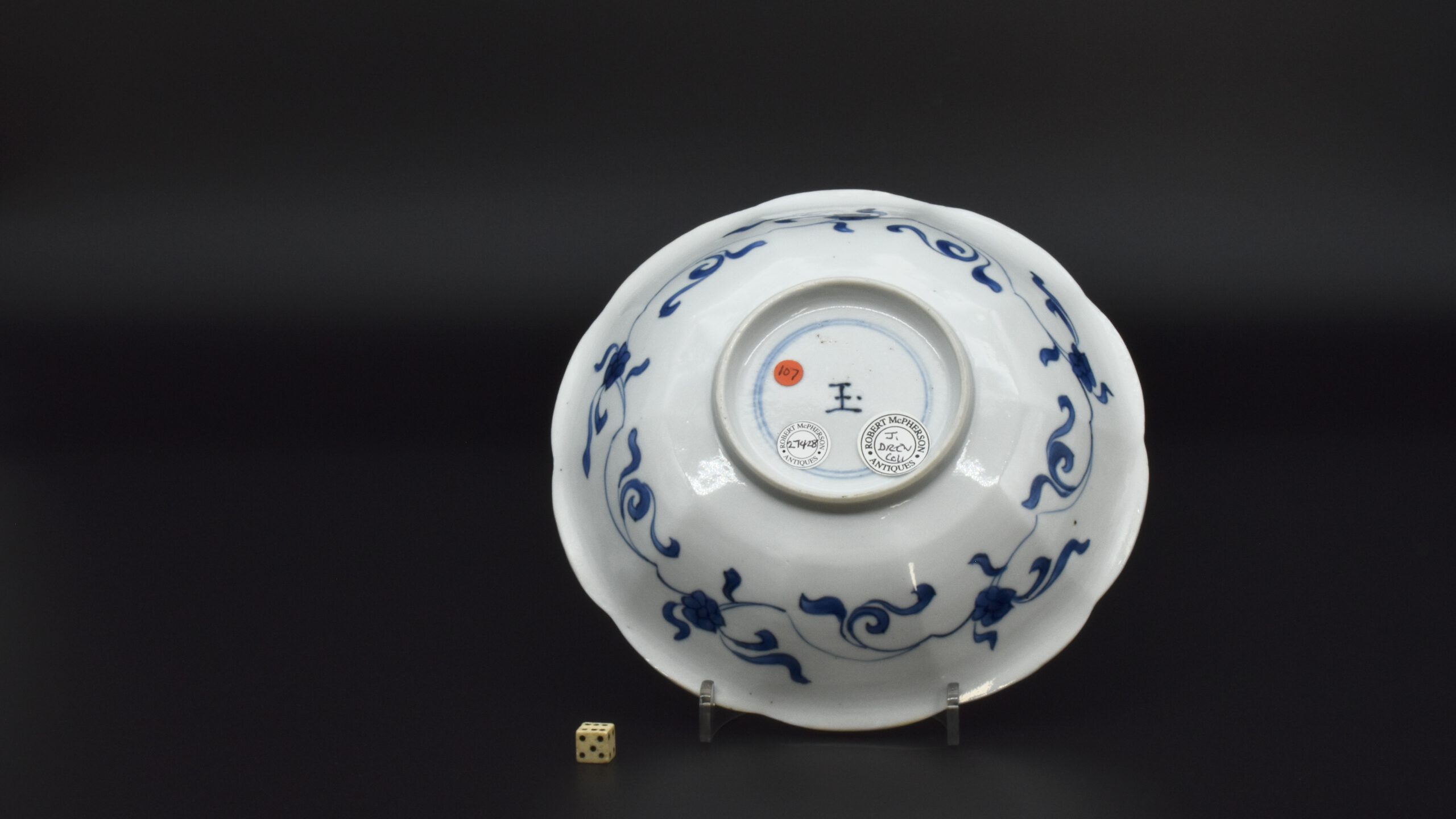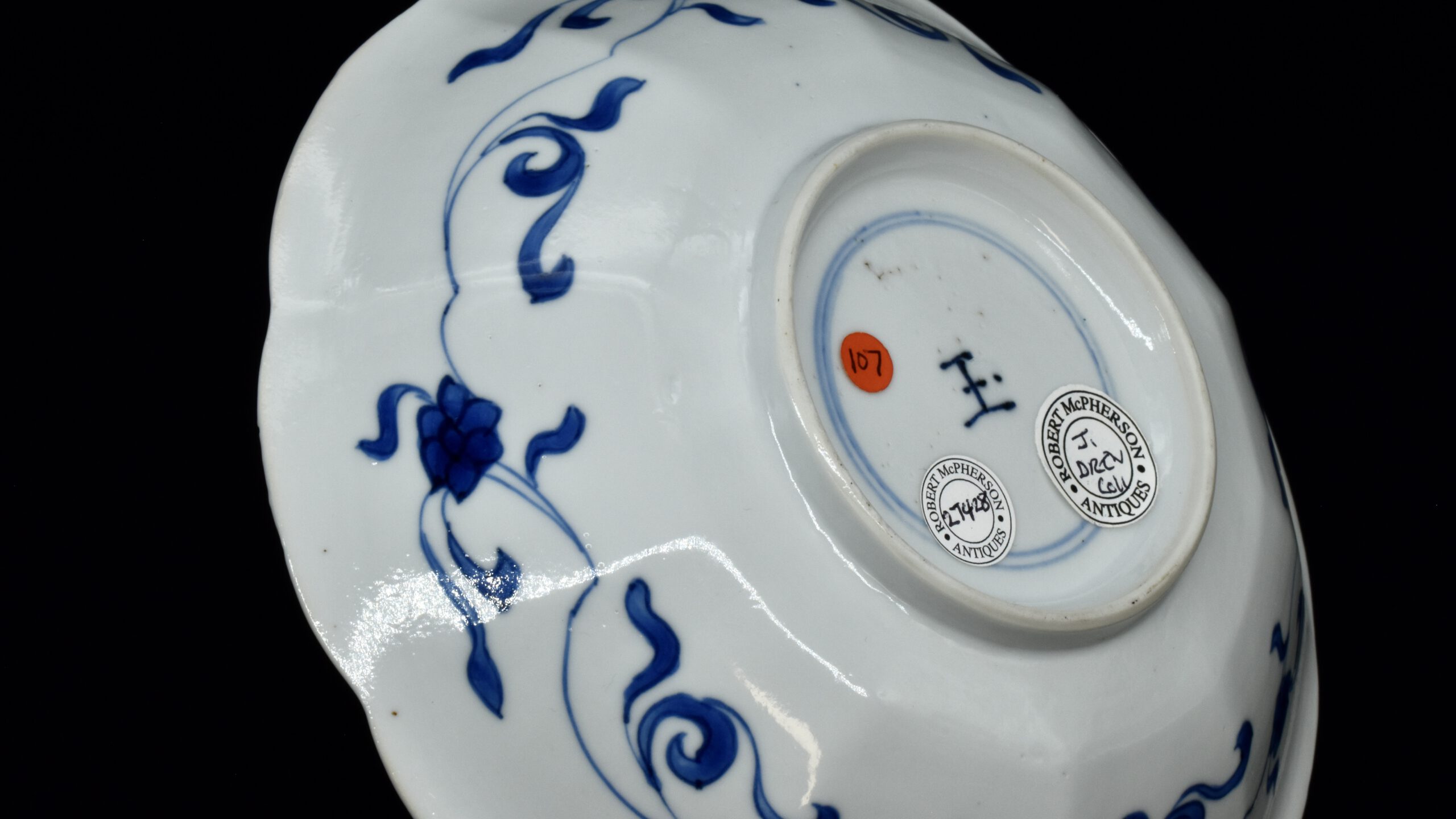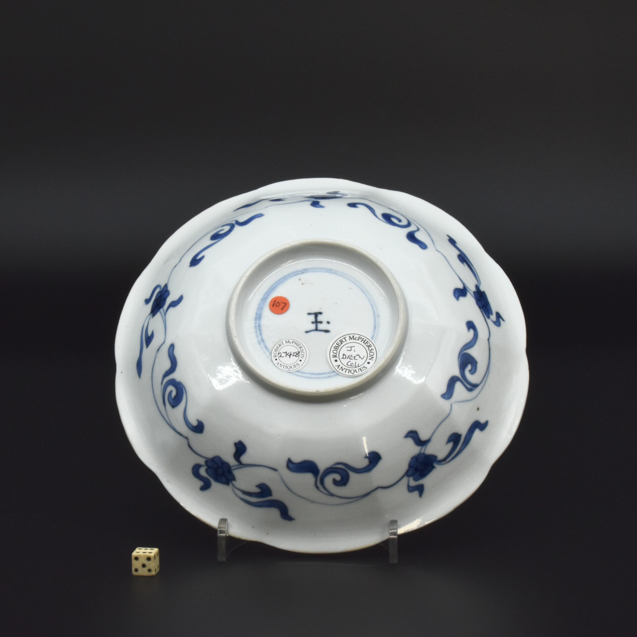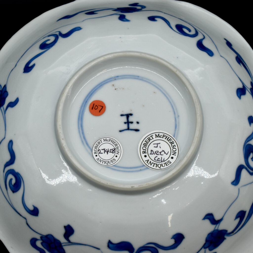 A Small Kangxi Blue and White Porcelain Flower Form Dish, Jingdezhen Kilns, c.1700. From the Collection of John Drew (1933 – 2006). This Kangxi porcelain dish was moulded to mimic the shape of a flower, the petal shaped panels are decorated with Lange Lyzen (Long Eliza in English), divided by two pairs of panels and two single panels of flowering plants. The plants include Dianthus chinensis referred to as a pink, peony, chrysanthemum. The central panel depicts a Lange Lyzen at a table with a table holding a lotus that was perhaps picked from the lotus display tin the jardiniere next to her. Small blue and white Chinese porcelain dishes, like the present Kangxi example, were very popular with the Dutch middle and upper classes at this time. In the Netherlands the thin elegant ladies were referred to as Lange Lyzen, and in England as `Long Eliza`. The base has the character 玉 pronounced Yu, meaning jade. The Chinese have a ranking system of materials, with jade being the highest of all materials.