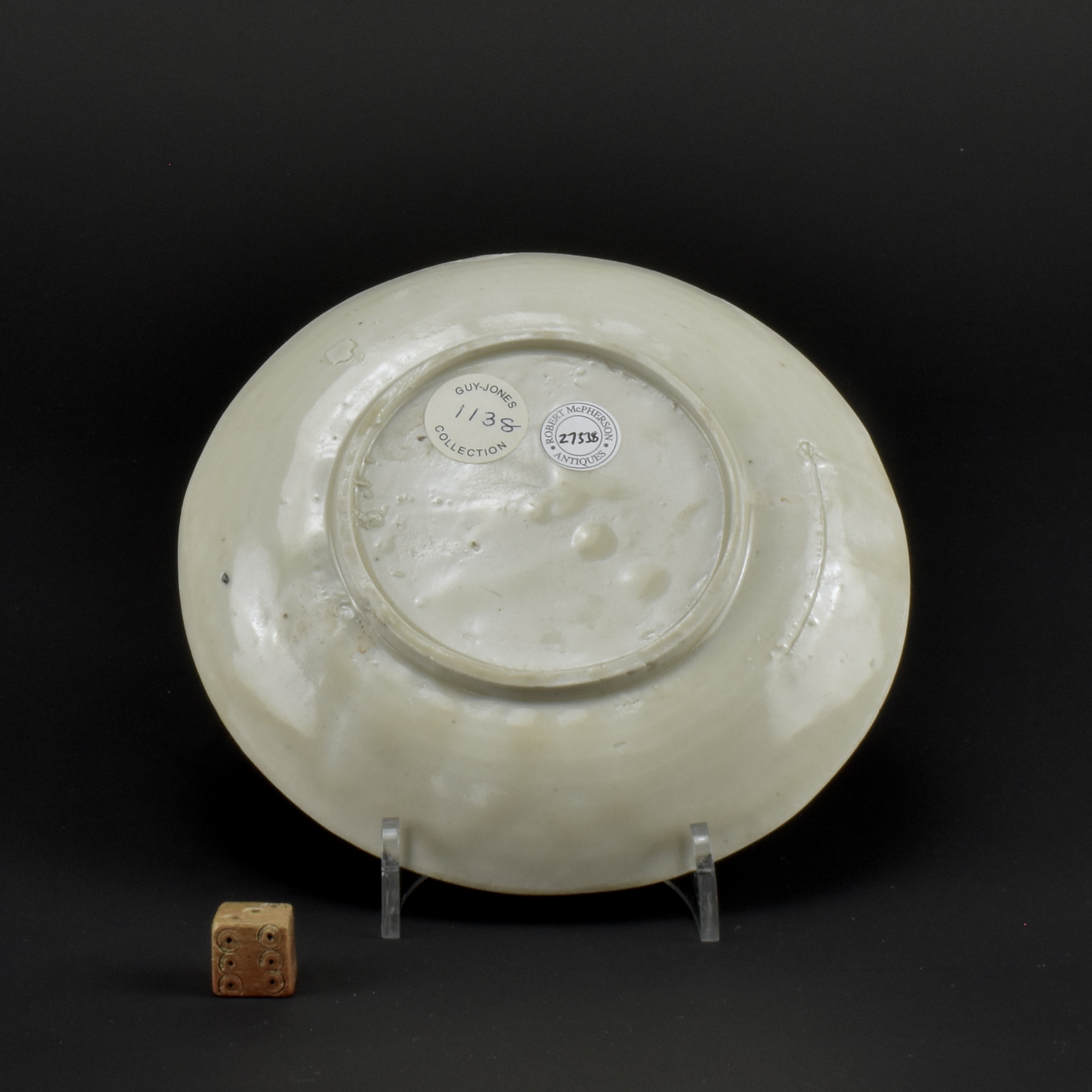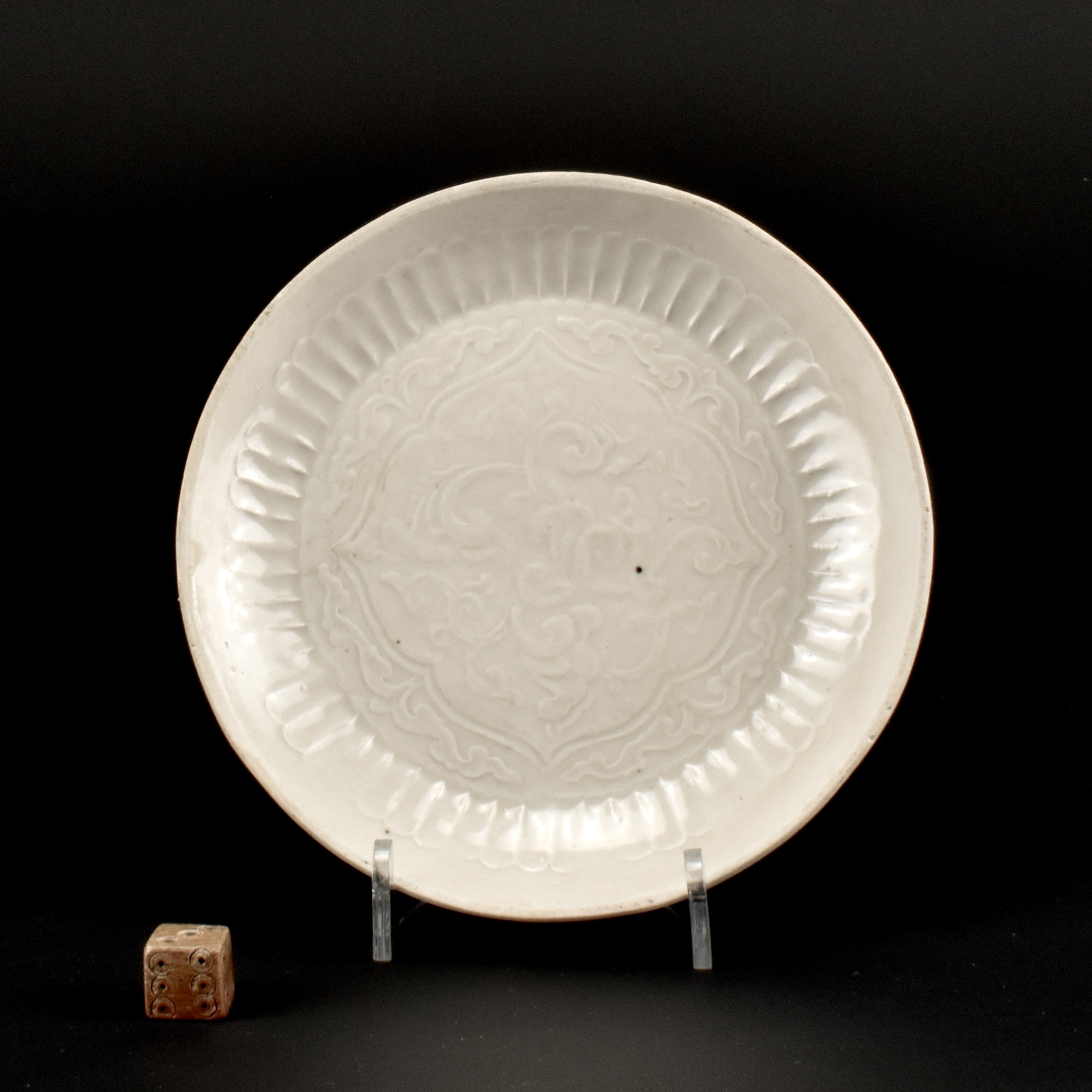 A Ding Ware Dish, Ding Kilns, Hebei Province, Song or Jin c.1050–1234. This Dingyao (Dingware) Pan is moulded and covered with a thin creamy glaze. The scalloped foliate moulded cavetto is decorated with scrolling stylised plants. The dish would have been fired on the rim, as it is the only unglazed part of the dish that has been wiped clean of glaze. The rim has a metal band to protect it as well as to hide the unglazed rough edge. The back is unevenly glazed with a scratch in the clay and a piece of waste clay adhering to curved edge Ding wares come from a region of northern China formerly known as Dingzhou (Ding prefecture); the white porcelains made there have been prized since the Song dynasty (960–1279). Archaeologists have found the main Ding kiln complex on the border of present-day Quyang in Hebei province. Provenance : Robert McPherson Antiques, probably stock number 14663 (bought at Christie’s South Kensington, London, 10th of July 2003). Mr and Mrs Guy-Jones purchased 16th of October 2003 (Guy-Jones label, item number 1138).