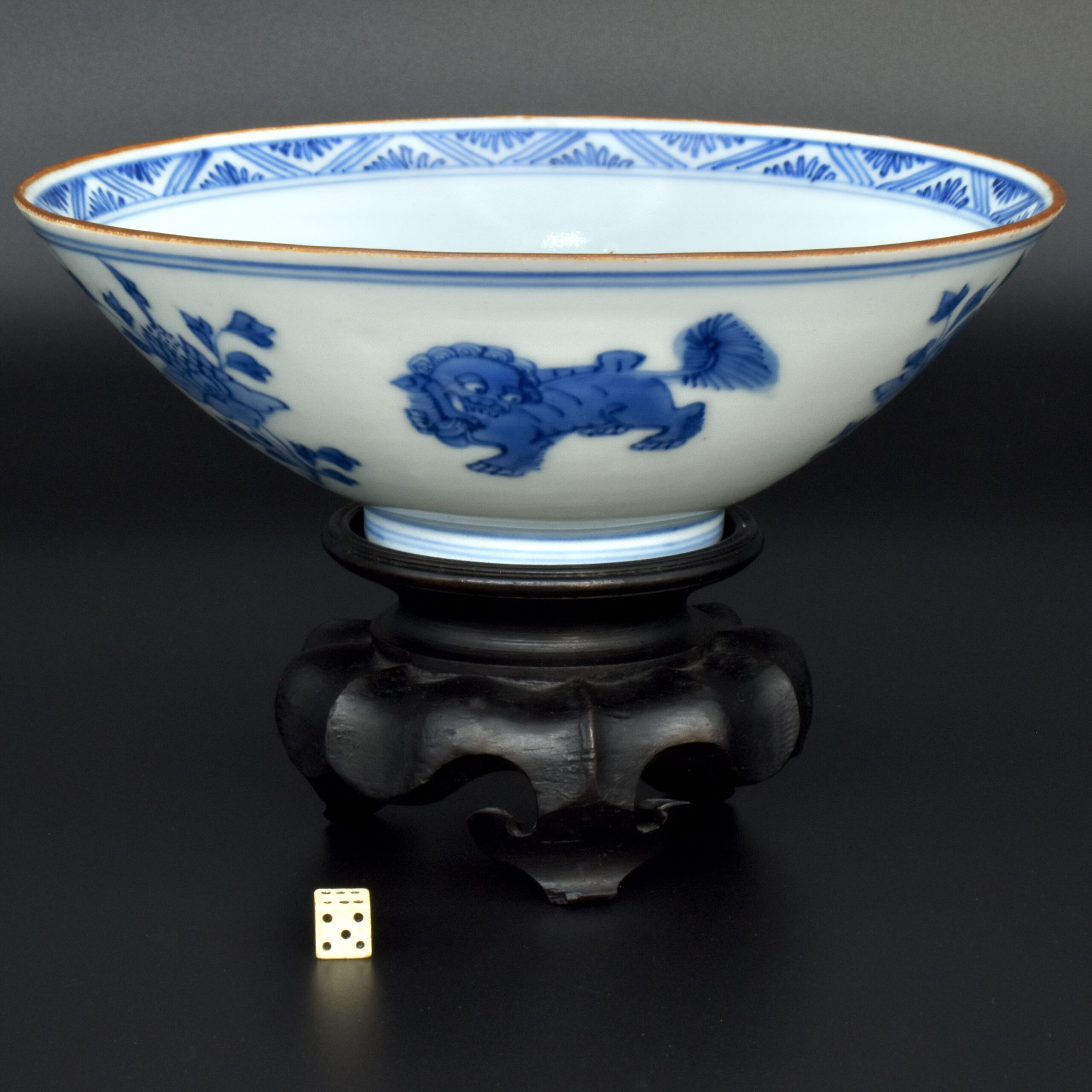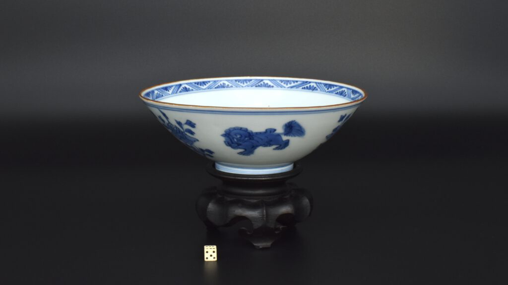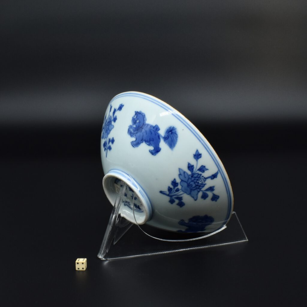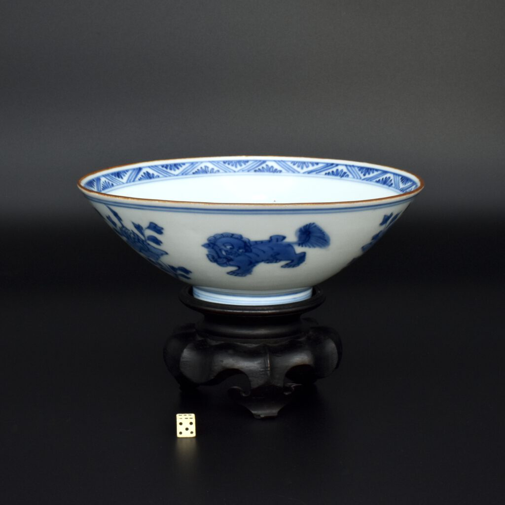A Transitional Blue and White Porcelain Conical Bowl. From the Collection of John Drew (1933 – 2006). This early Qing dynasty bowl dates to the Shunzhi period 1644-1661. The shallow blue and white porcelain bowl is decorated with Dogs of Fu to the Exterior with peony between, and peony to the well of the bowl. The rim is dressed in brown iron-oxide. The base with a Jiajing mark (apocryphal Ming mark, Jiajing 1522-1566). The distinctive form of this Transitional porcelain bowl was popular during the Shunzhi Period (1644-1661). The blue and white design of the present example is the most commonly encountered pattern on Shunzhi porcelain bowls of this form.