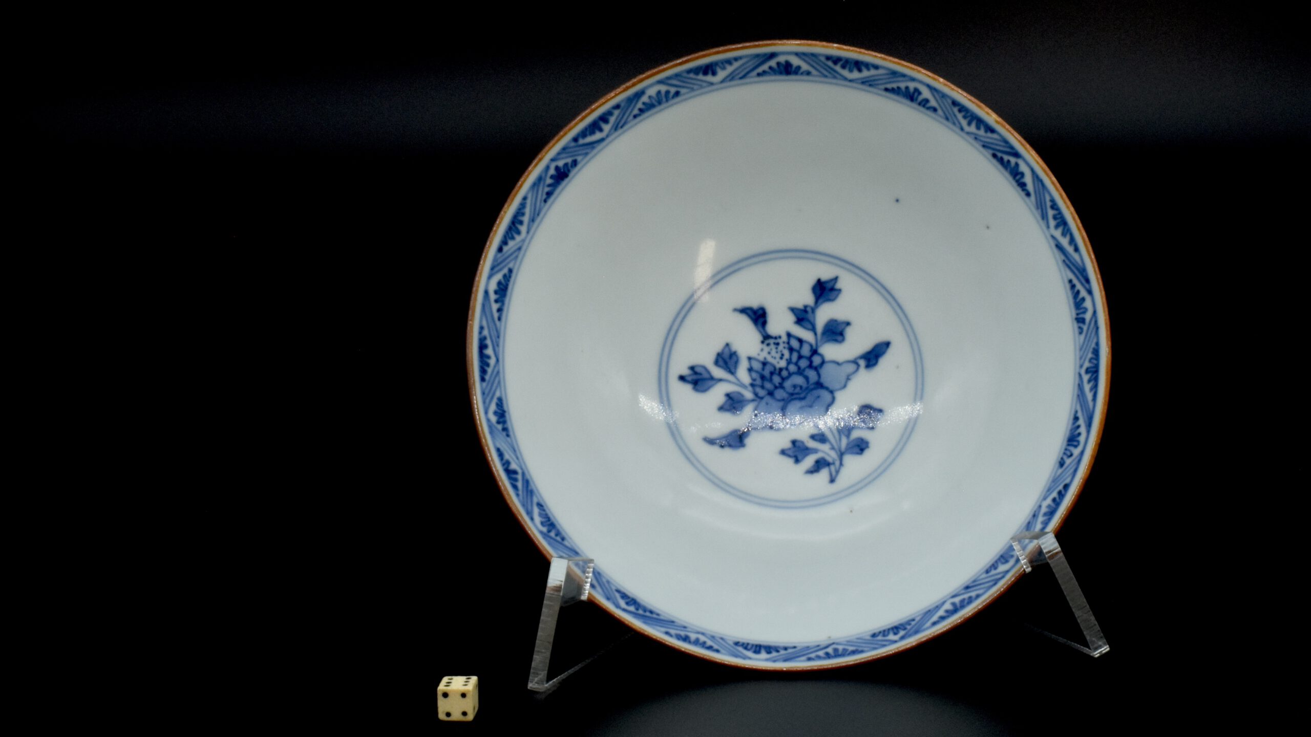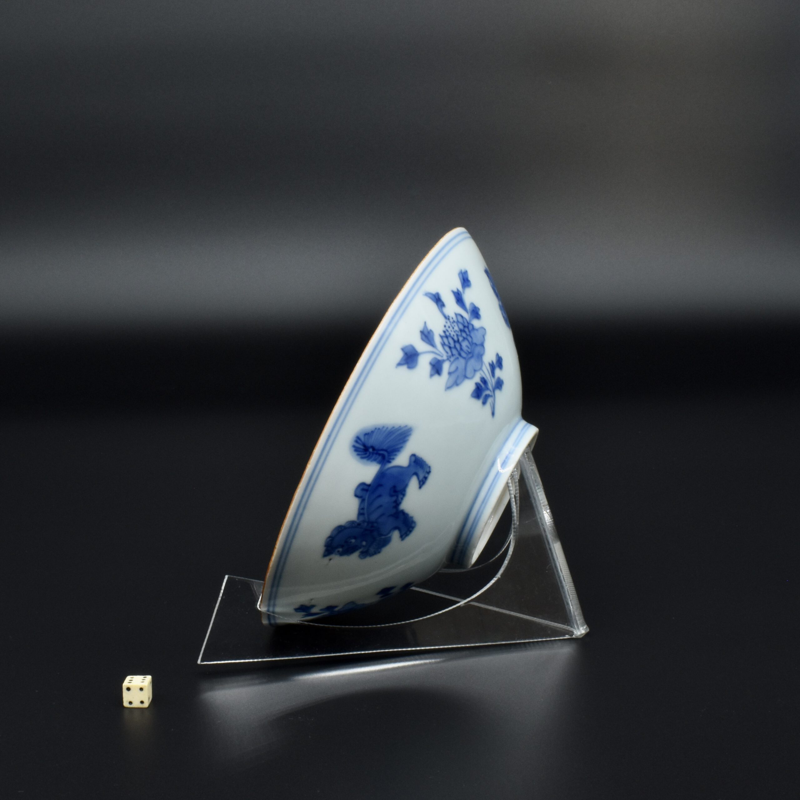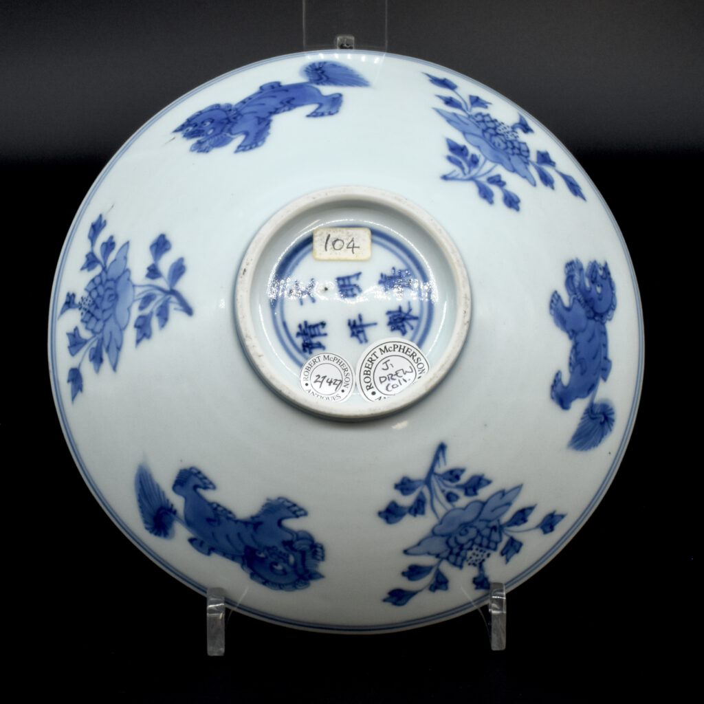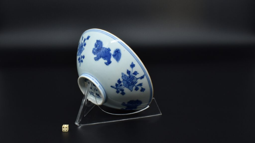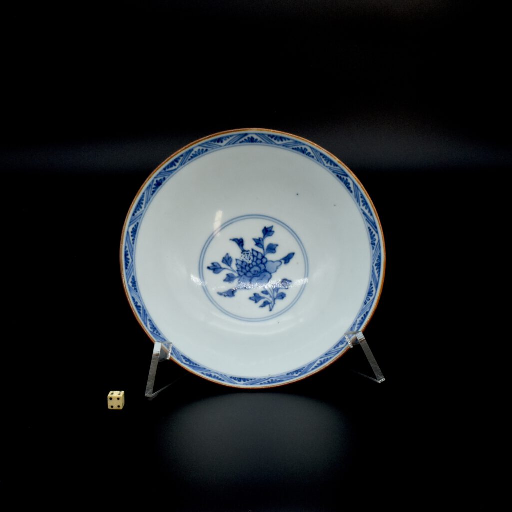 A Transitional Blue and White Porcelain Conical Bowl. From the Collection of John Drew (1933 – 2006). This early Qing dynasty bowl dates to the Shunzhi period 1644-1661. The shallow blue and white porcelain bowl is decorated with Dogs of Fu to the Exterior with peony between, and peony to the well of the bowl. The rim is dressed in brown iron-oxide. The base with a Jiajing mark (apocryphal Ming mark, Jiajing 1522-1566). The distinctive form of this Transitional porcelain bowl was popular during the Shunzhi Period (1644-1661). The blue and white design of the present example is the most commonly encountered pattern on Shunzhi porcelain bowls of this form.