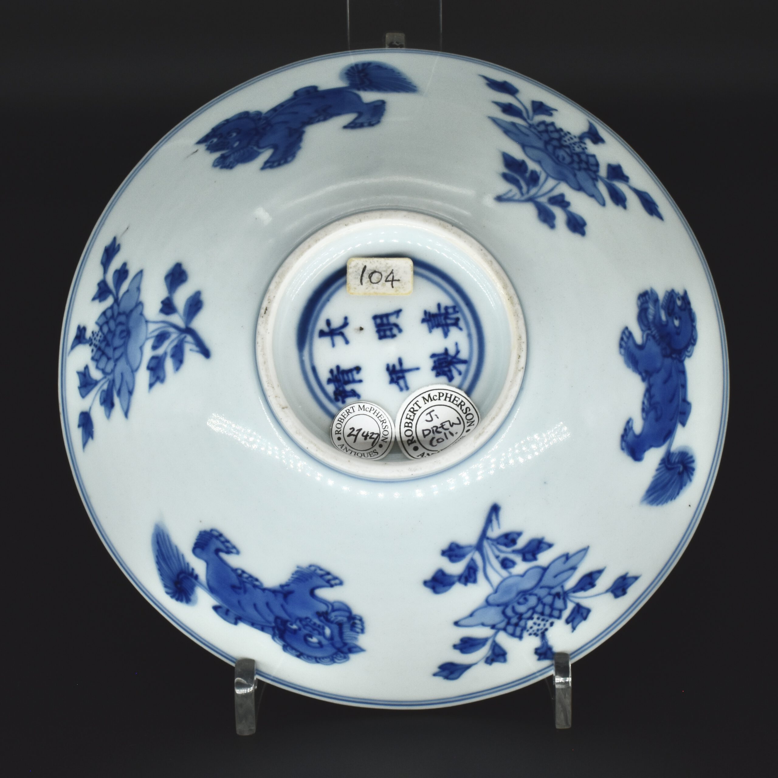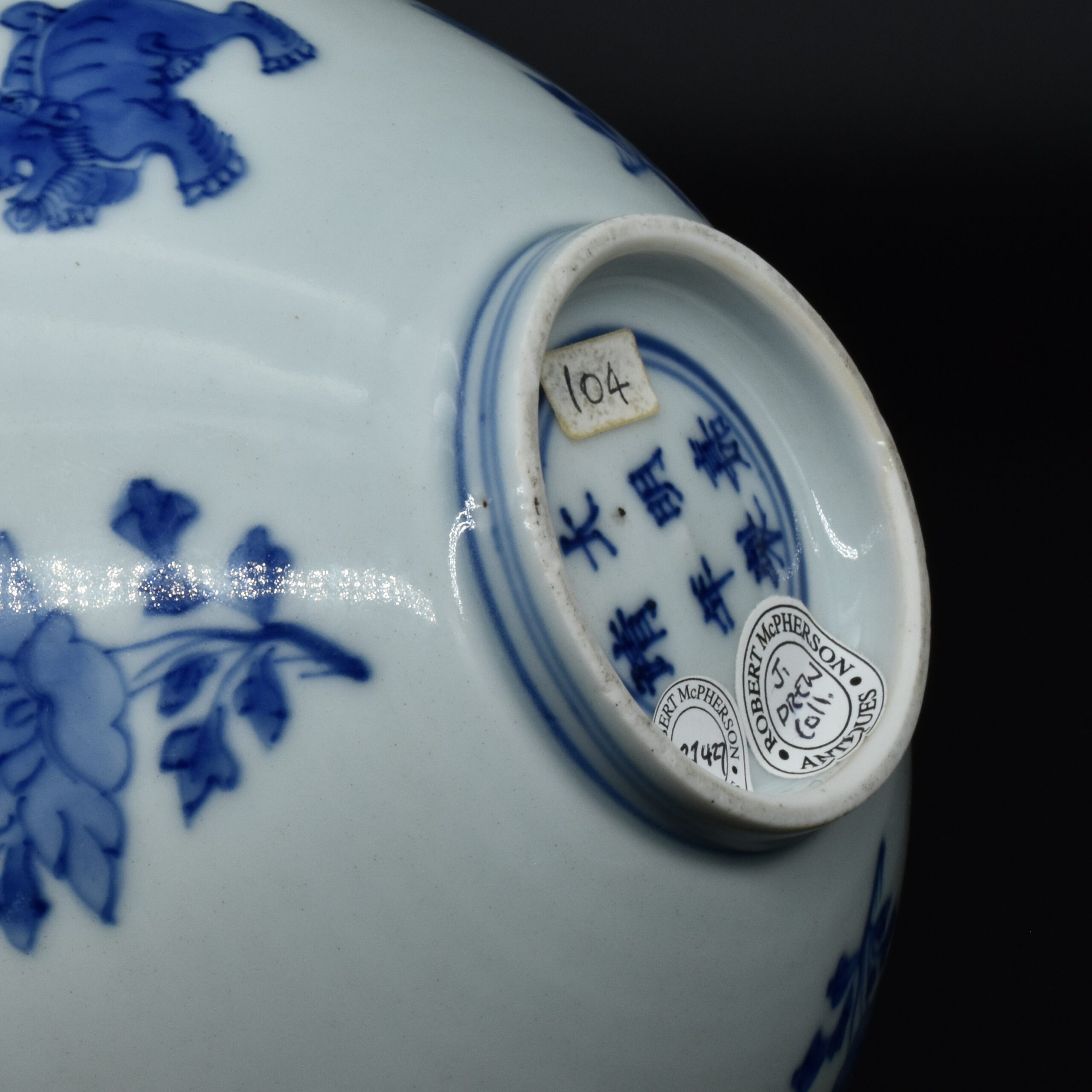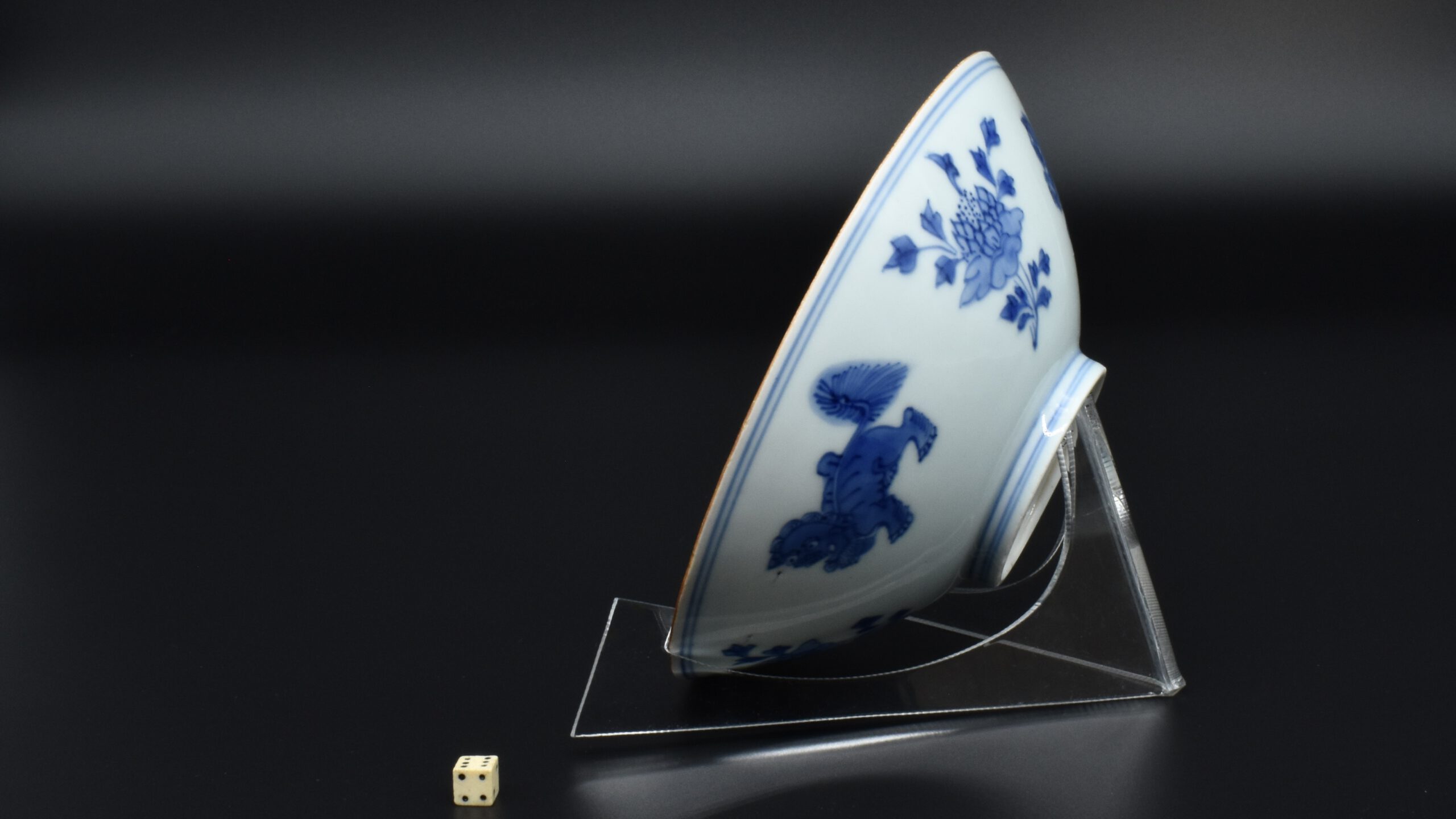 A Transitional Blue and White Porcelain Conical Bowl. From the Collection of John Drew (1933 – 2006). This early Qing dynasty bowl dates to the Shunzhi period 1644-1661. The shallow blue and white porcelain bowl is decorated with Dogs of Fu to the Exterior with peony between, and peony to the well of the bowl. The rim is dressed in brown iron-oxide. The base with a Jiajing mark (apocryphal Ming mark, Jiajing 1522-1566). The distinctive form of this Transitional porcelain bowl was popular during the Shunzhi Period (1644-1661). The blue and white design of the present example is the most commonly encountered pattern on Shunzhi porcelain bowls of this form.