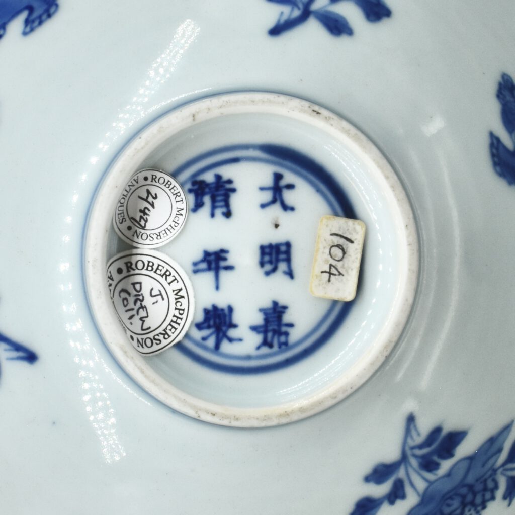 Apocryphal marks are frequently encountered on Chinese porcelain particularly on Kangxi Blue and White Porcelain (1662-1722). These retrospective six character marks started to be used during the chaotic end of the Ming dynasty at a time referred to in the West as the Transitional period. From what I have seen it appears as if they were first used during the reign of Tianqi (1621-1627), at this period they are commonly encountered on pieces made for the Japanese market but are more rarely found on objects made for the West. Only a select few Ming marks were `copied`, the six character mark of the Ming Emperor Chenghua who reigned from 1465 to 1487 being by far the most common, other Ming marks include Jiajing (1522-1566) and less frequently Wanli (1573-1620). These marks were not added to the piece to deceive, but more as a sign of reverence, and maybe even aspiration, to the great potters of the Ming dynasty (1368-1644). Occasionally they are used on pieces copying Ming Porcelain shapes and designs, these objects were probably made for collectors who could not afford the Ming original. The marks on these `copies` are often drawn in the calligraphic style of the Ming originals.