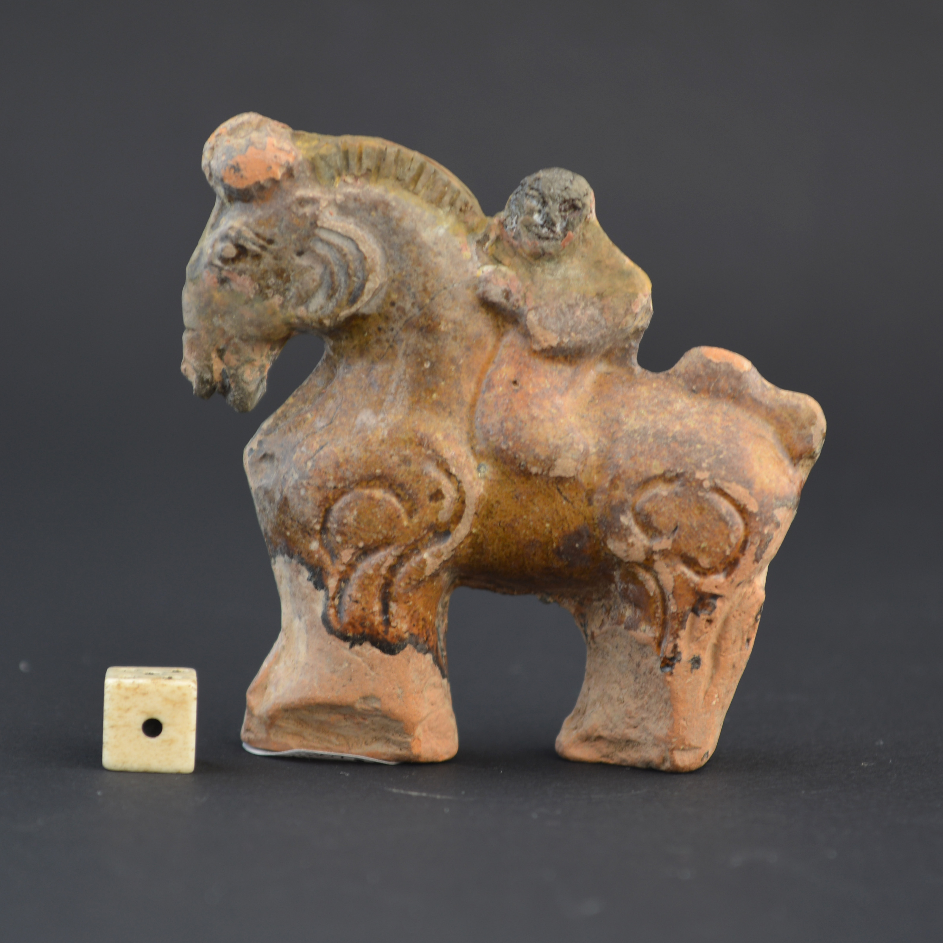 A Mingqi miniature stoneware model of a horse and rider, Late Western Han or Eastern Han c.1st century B.C. to 2nd century A.D. Simply made from a two piece press-mould with the mould-line clearly showing. The dense grey stoneware is covered with a dark yellow-amber glaze.